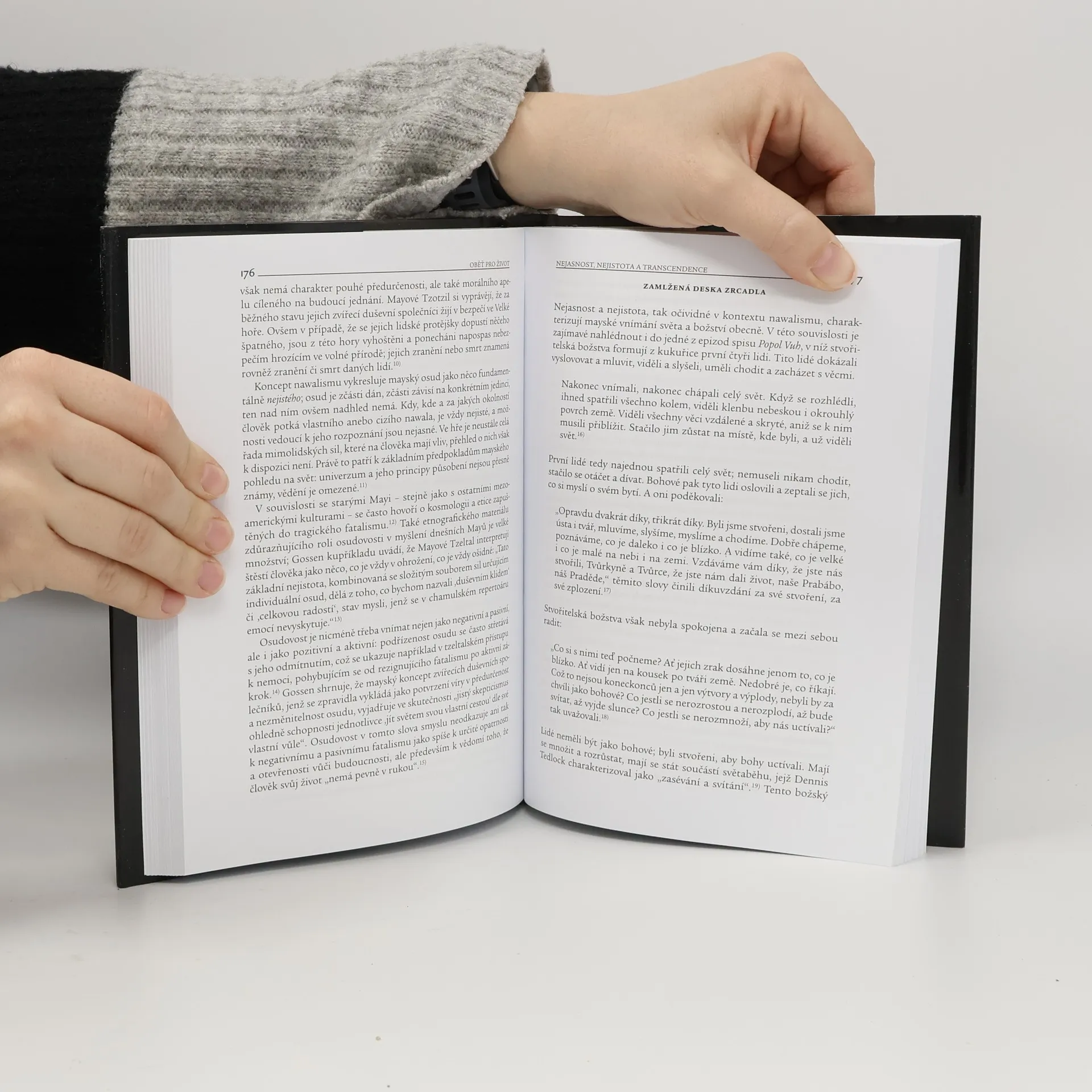 Kniha se zabývá náboženským světem současných Mayů obývajících Guatemalskou vysočinu. Zaměřuje se na mayskou kosmologii a pojetí božstev, vztah k přírodě a horám, obětní a poutní rituály a jejich existenciální ukotvení. Pozornost je také věnována mayskému kulturnímu obrození a s ním spjatým dynamickým a kreativním míšením původní lokální mayské tradice a současného globálního spirituálního diskursu. Práce si tak všímá jak procesu reprezentace, exotizace a romantizace „druhých“, tak procesu hledání identity a autenticity v dnešním komplikovaném a proměnlivém světě. Kniha podává svěží pohled na současnou situaci domorodých, šamanistických a animistických kultur, ale i na některé teoretické problémy a témata soudobé antropologie náboženství.