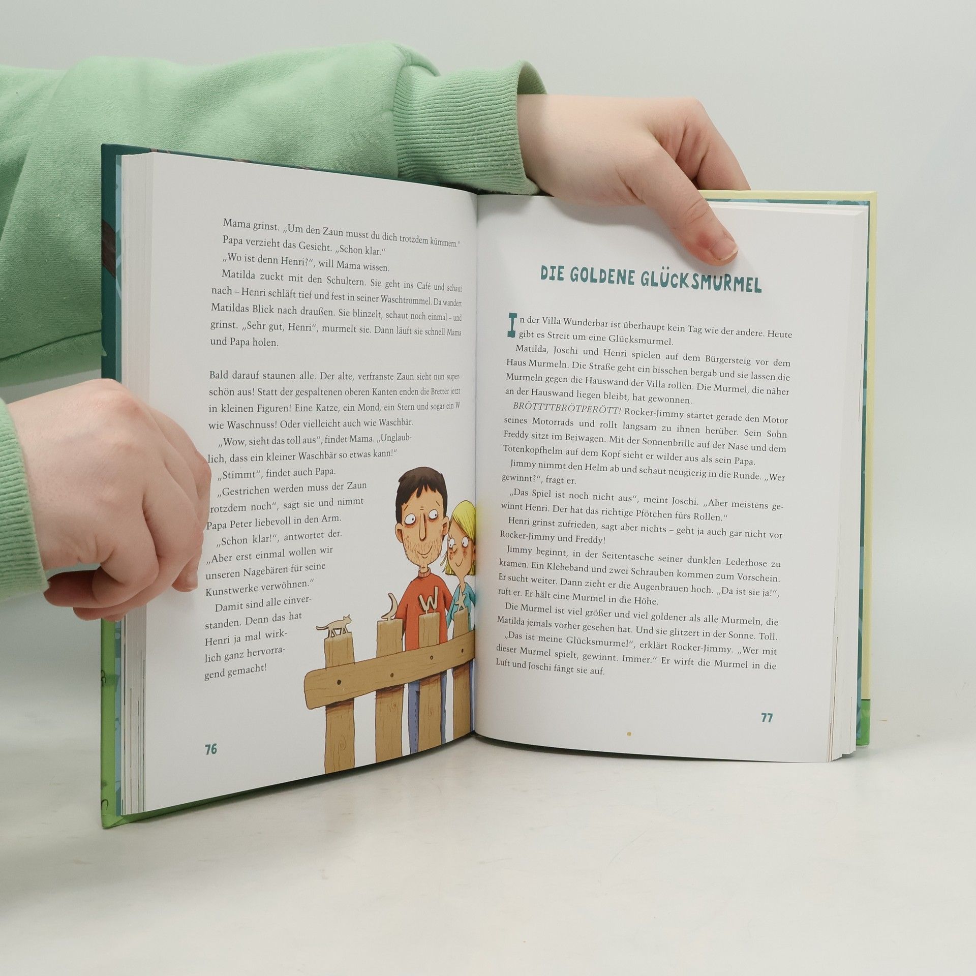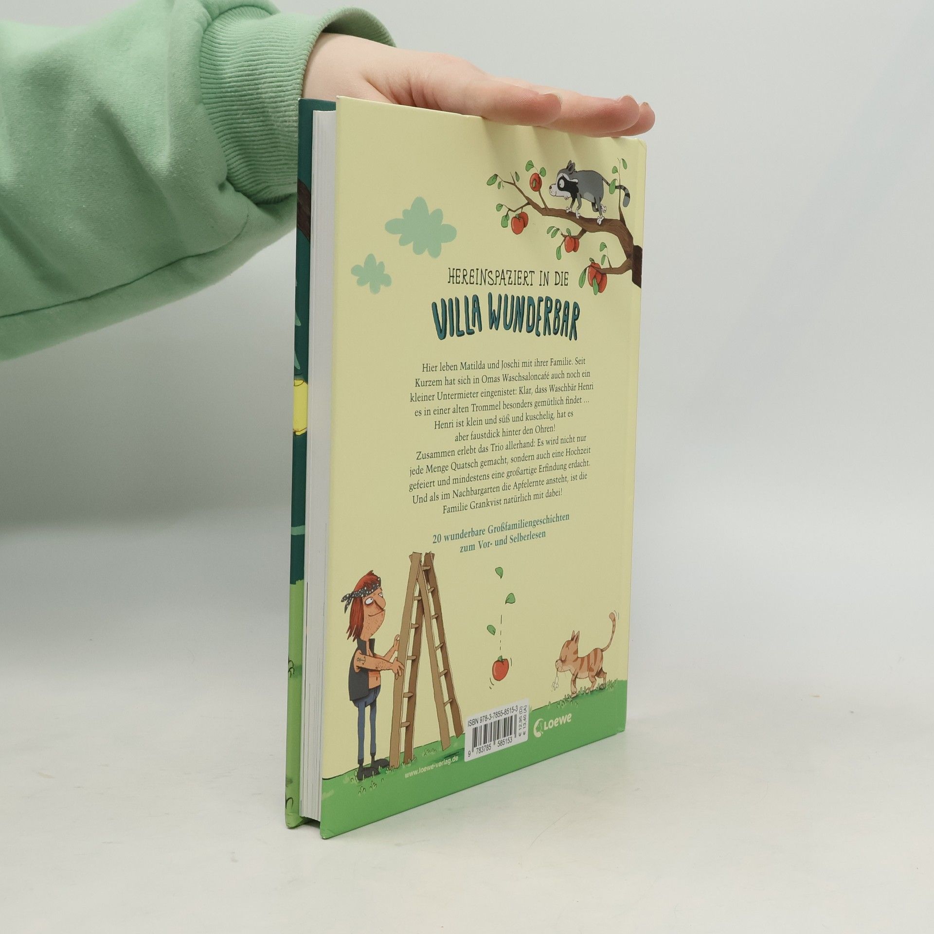 20 wunderbare Großfamiliengeschichten zum Vor- und Selberlesen: Hereinspaziert in die Villa Wunderbar ! Hereinspaziert in die Villa Wunderbar! Hier leben Matilda und Joschi mit ihrer Familie. Seit Kurzem hat sich in Omas Waschsaloncafé auch noch ein kleiner Untermieter eingenistet: Klar, dass Waschbär Henri es in einer alten Trommel besonders gemütlich findet … Henri ist klein und süß und kuschelig, hat es aber faustdick hinter den Ohren! Zusammen erlebt das Trio allerhand: Es wird nicht nur jede Menge Quatsch gemacht, sondern auch eine Hochzeit gefeiert und mindestens eine großartige Erfindung erdacht. Und als im Nachbargarten die Apfelernte ansteht, ist die Familie Grankvist natürlich mit dabei! Mit viel Liebe haben die Autorinnen Sandra Grimm und Ann-Katrin Heger 20 originelle und lustige Vorlesegeschichten um den Kosmos der Villa Wunderbar und ihre Bewohner – ein buntes Cousin-Cousinen-Duo, das mit Waschbär Henri den familiengeführten Waschsalon mit Café mal mehr oder weniger freiwillig aufmischt – gesponnen. In dieser farbig illustrierten Reihe gibt es beim Vorlesen auf jeder Seite Bilder zu entdecken, aber auch zum Selberlesen im Grundschulalter sind die Geschichten geeignet.