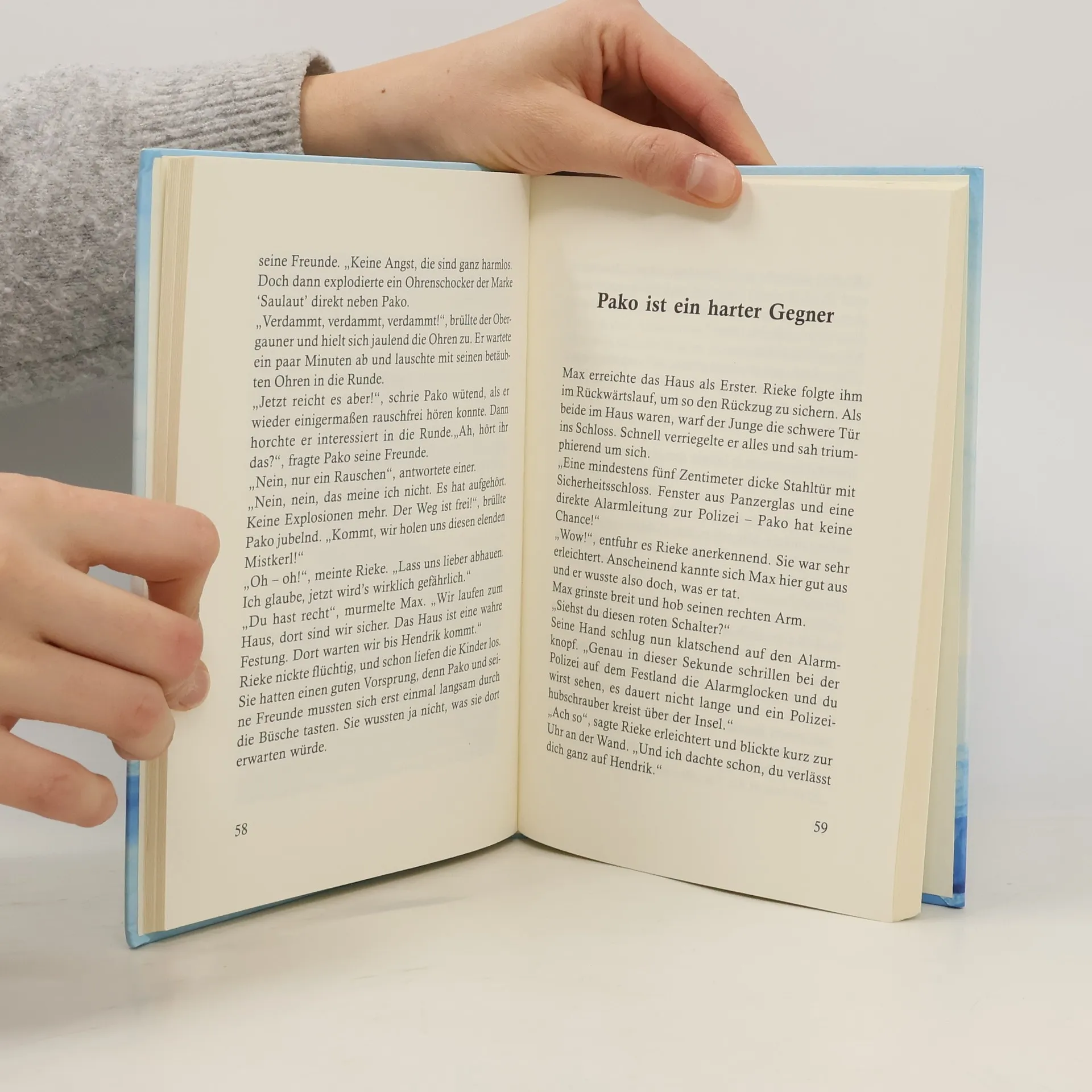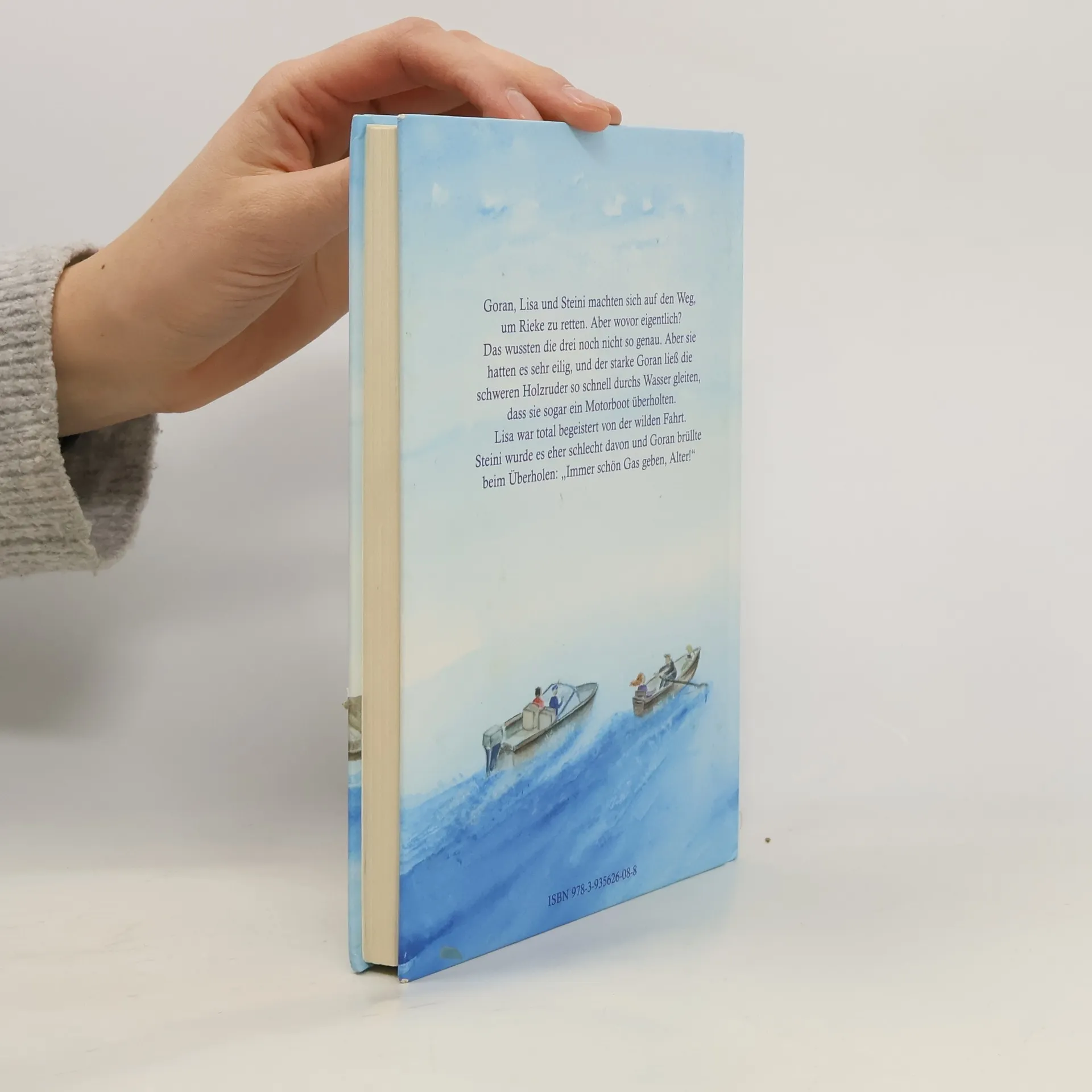 Goran, Lisa und Steini machten sich auf den Weg, um Rieke zu retten. Aber wovor eigentlich? Das wussten die drei noch nicht so genau. Aber sie hatten es sehr eilig, und der starke Goran ließ die schweren Holzruder so schnell durchs Wasser gleiten, dass sie sogar ein Motorboot überholten. Lisa war total begeistert von der Fahrt. Steini wurde es eher schlecht davon und Goran brüllte beim Überholen: "Immer schön Gas geben, Alter!"