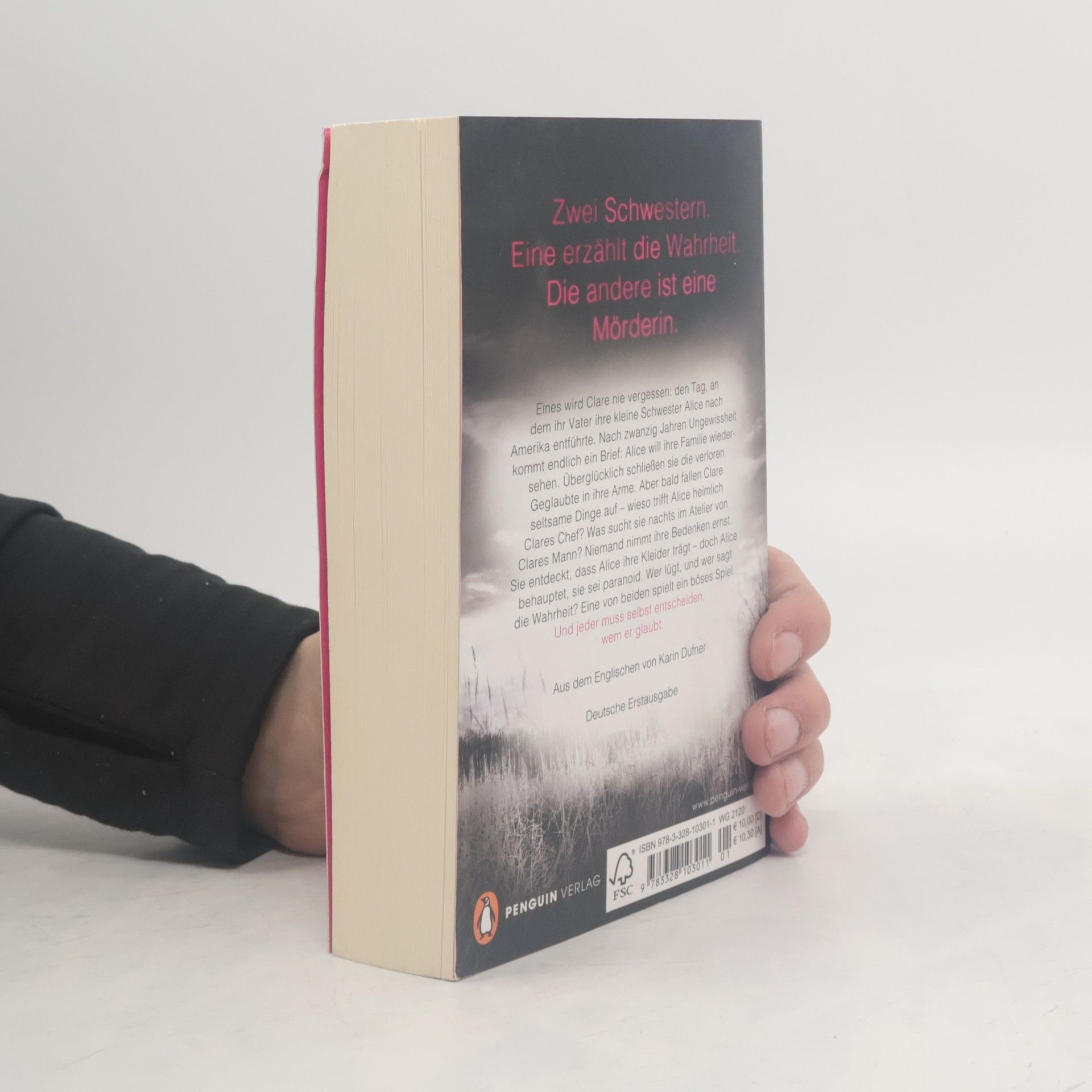 Zwei Schwestern. Eine erzählt die Wahrheit. Die andere ist eine Mörderin. Eines wird Clare nie vergessen: den Tag, an dem ihr Vater ihre kleine Schwester Alice nach Amerika entführte. Nach zwanzig Jahren Ungewissheit kommt endlich ein Brief: Alice will ihre Familie wiedersehen. Überglücklich schließen sie die verloren Geglaubte in ihre Arme. Aber bald fallen Clare seltsame Dinge auf: Wieso trifft Alice heimlich Clares Chef? Was sucht sie nachts im Atelier von Clares Mann? Niemand nimmt ihre Bedenken ernst. Sie entdeckt, dass Alice ihre Kleider trägt – doch Alice behauptet, sie sei paranoid. Wer lügt, und wer sagt die Wahrheit? Eine von beiden spielt ein böses Spiel. Und jeder muss selbst entscheiden, wem er glaubt.