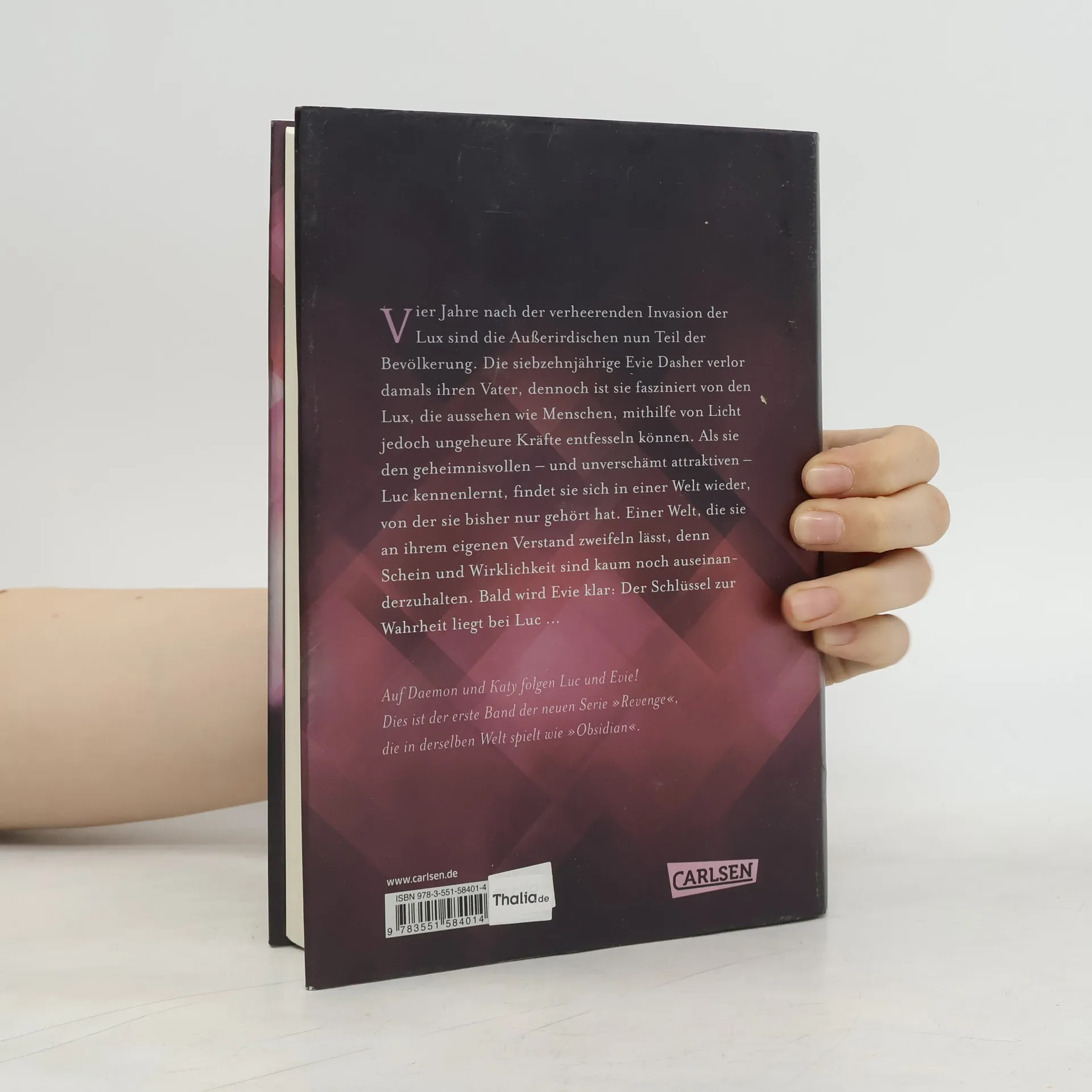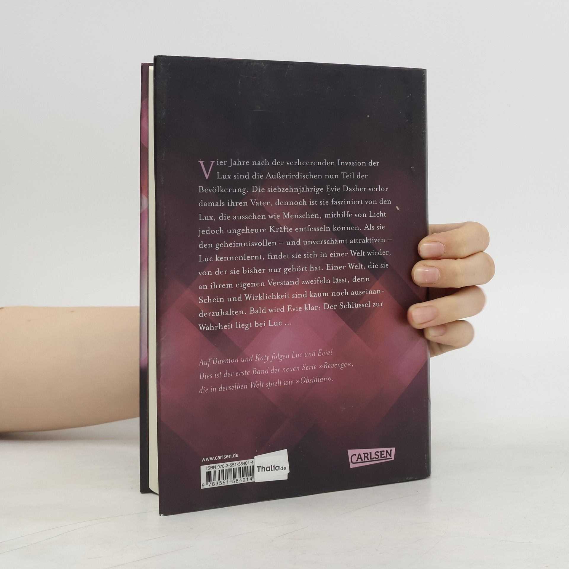Mit den Fingerkuppen strich er mir über die Wange und mein Körper reagierte sofort. »Der Deal war: Ich halte mich von dir fern ...« Er hielt inne und seine Augen leuchteten immer heller. »Solange du dich von mir fernhältst.« Vier Jahre nach der verheerenden Invasion der Lux gehören die Außerirdischen zur Bevölkerung. Die siebzehnjährige Evie Dasher verlor damals ihren Vater, an mehr kann sie sich nicht erinnern. Dennoch ist sie fasziniert von den Lux, die zwar aussehen wie Menschen, jedoch ungeheure Kräfte entfesseln können. Als Evie den geheimnisvollen – und unverschämt attraktiven – Luc kennenlernt, ist sie sofort fasziniert. Doch bald kann sie Schein und Wirklichkeit nicht mehr auseinanderhalten und alles, woran sie geglaubt hat, steht plötzlich infrage. Der Schlüssel zur Wahrheit liegt bei Luc. Doch kann sie ihm trauen? Mit »Revenge« kehrt Jennifer L. Armentrout in die Welt der Spiegel-Bestsellerserie »Obsidian« zurück. Knisternde Spannung! Alle bisherigen Bände der Romantasy-Serie:Revenge. SternensturmRebellion. SchattensturmRedemption. Nachtsturm