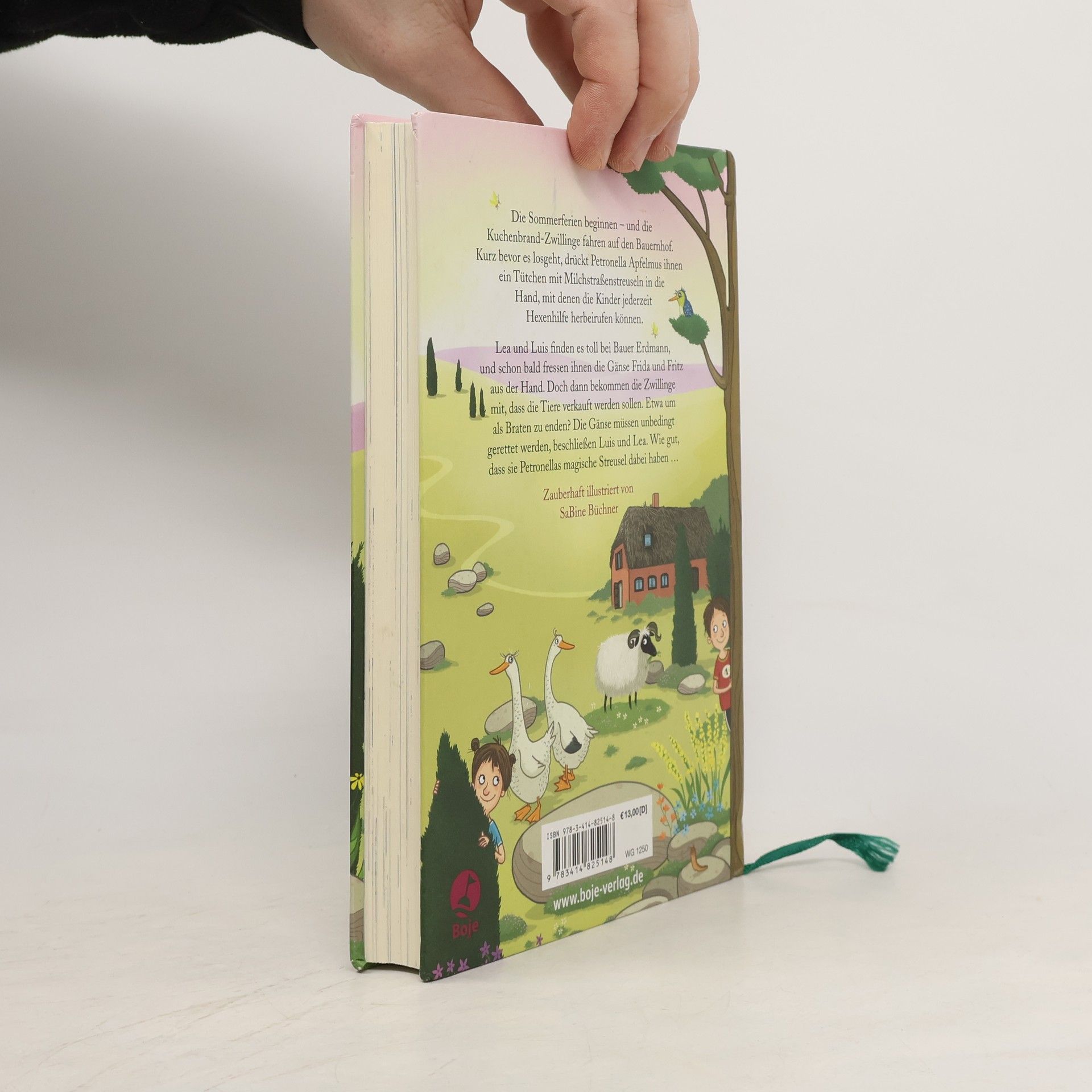 Die Sommerferien beginnen - und die Kuchenbrand-Zwillinge fahren auf den Bauernhof. Kurz bevor es losgeht, drückt Petronella Apfelmus ihnen ein Tütchen mit Milchstraßenstreuseln in die Hand. Damit können sie jederzeit Hexenhilfe herbeirufen. Lea und Luis finden es toll bei Bauer Erdmann, schon bald fressen ihnen die Gänse Frida und Fritz aus der Hand. Doch dann bekommen die Zwillinge mit, dass die Tiere verkauft werden sollen. Etwa um als Braten zu enden? Die Gänse müssen unbedingt gerettet werden, beschließen Luis und Lea. Wie gut, dass sie Petronellas magische Streusel dabei haben ... Zauberhaft illustriert von SaBine Büchner