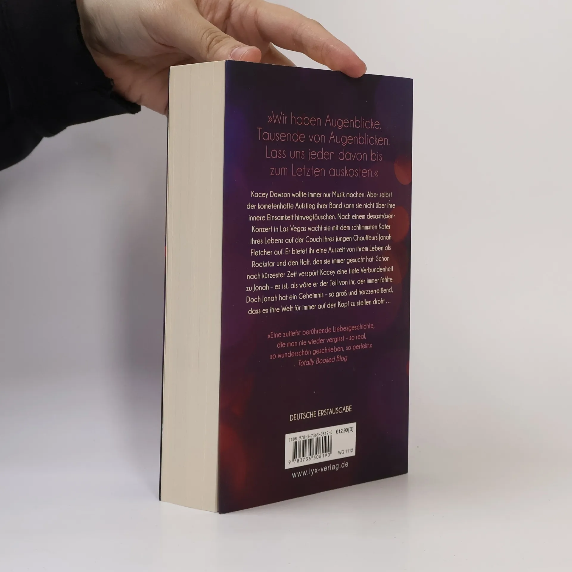 „Wir haben Augenblicke. Tausende von Augenblicken. Lass uns jeden davon bis zum Letzten auskosten.“ Kacey Dawson wollte immer nur Musik machen. Aber selbst der kometenhafte Aufstieg ihrer Band kann sie nicht über ihre innere Einsamkeit hinwegtäuschen. Nach einem desaströsen Konzert in Las Vegas wacht sie mit dem schlimmsten Kater ihres Lebens auf der Couch ihres jungen Chauffeurs Jonah Fletcher auf. Er bietet ihr eine Auszeit von ihrem Leben als Rockstar und den Halt, den sie immer gesucht hat. Schon nach kürzester Zeit verspürt Kacey eine tiefe Verbundenheit zu Jonah - es ist, als wäre er der Teil von ihr, der immer fehlte. Doch Jonah hat ein Geheimnis - so groß und herzzerreißend, dass es ihre Welt für immer auf den Kopf zu stellen droht ... „Eine zutiefst berührende Liebesgeschichte, die man nie wieder vergisst - so real, so wunderschön geschrieben, so perfekt.“ Totally Booked Blog Band 1 des All-In-Duetts