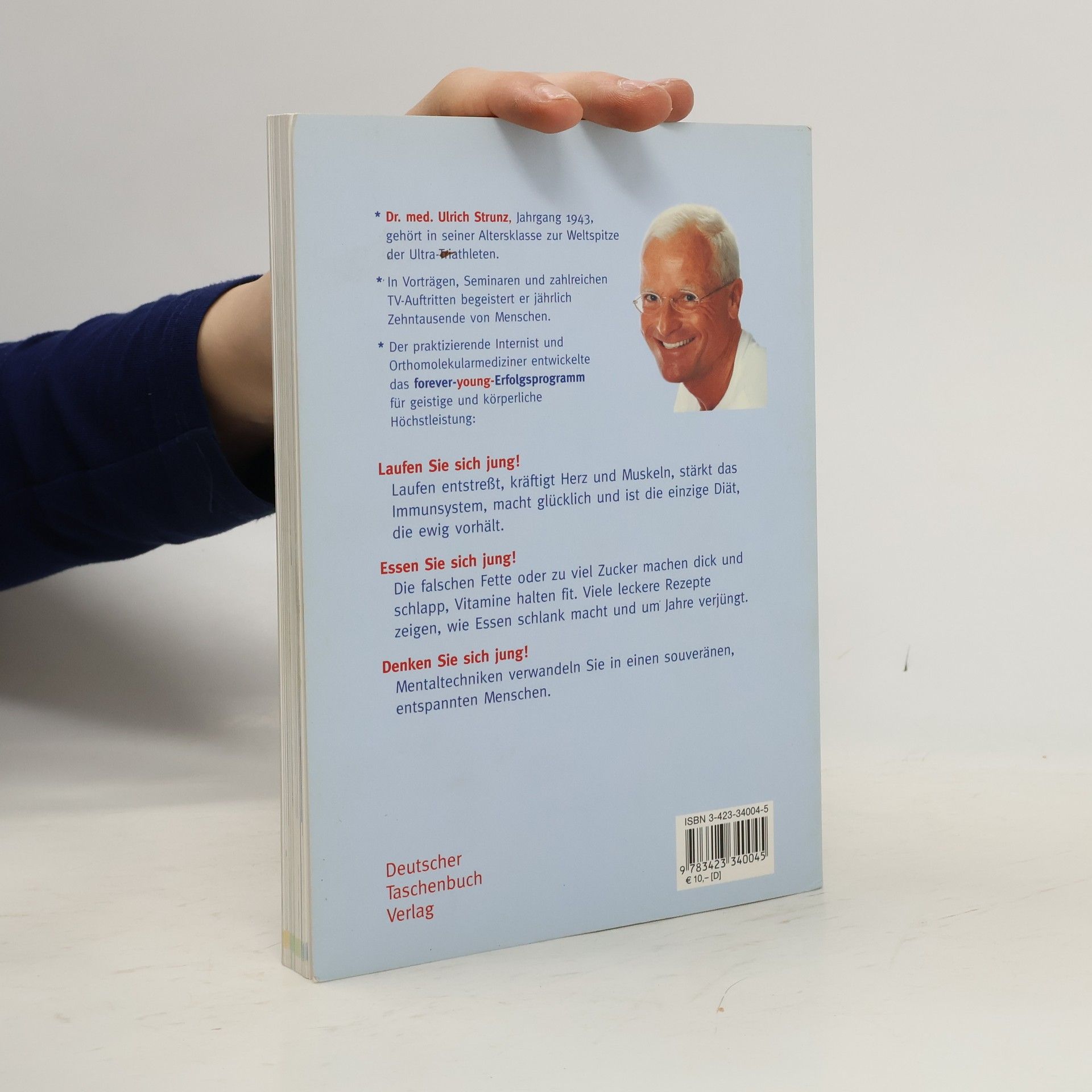 »Dieser Mann ändert Ihr Leben.« News Der Fitness-Bestseller - jetzt endlich im Taschenbuch! Jung aussehen, schnell denken, fit bleiben: Dr. med. Ulrich Strunz zeigt, wie Sie Ihre biologische Uhr zurückdrehen können. Werden Sie spielend körperlich und geistig topfit! Das Forever-young-Programm für körperliche und geistige Höchstleistung ruht auf drei Säulen: 1. Laufen Sie sich jung! Laufen ist eine Wunderpille: es entstresst, kräftigt Herz und Muskeln, stärkt das Immunsystem, macht glücklich und ist die einzige Diät, die ewig hält. 2. Essen Sie sich jung! Die falschen Fette oder zu viel Zucker machen dick und und schlapp, Vitamine halten fit. Viel leckere Rezepten zeigen, wie Essen schlank macht und um Jahre verjüngt. 3. Denken Sie sich jung! Mentaltechniken verwandeln Sie in einen souveränen, entspannten Menschen, der Ruhe und Gelassenheit ausstrahlt.