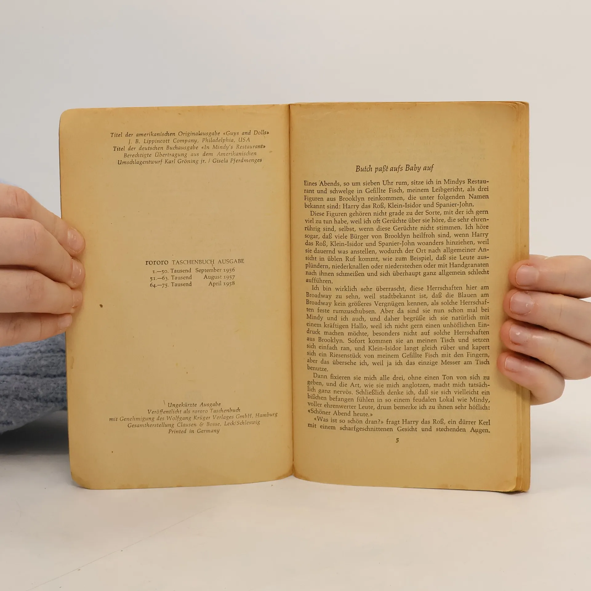 Runyonesque: Prosa von „Amerikas größtem Reporter“. Schwere Jungs, leichte Mädchen. Damon Runyons (1884–1946) Geschichten erzählen von halbseidenen Helden, die ihre dunklen Geschäfte unter den Neonlichtern des Broadways abwickeln. Sie heißen „Harry das Roß“ oder „Spanier-John“, haben einen üblen Ruf und schrecken nicht davor zurück, die feine Gesellschaft auszuplündern und niederzuknallen. Mittendrin im Geschehen: Der Ich-Erzähler Rusty, der alle schweren Jungs und leichten Mädchen Manhattans kennt, selbst aber eine blütenreine Weste hat – behauptet er zumindest. Runyon nahm bereits als Teenager am Spanisch-Amerikanischen Krieg 1898 teil, berichtete aus Mexiko von der Pancho-Villa-Expedition und aus Europa vom Ersten Weltkrieg. Später machte er sich einen Namen als Box- und Baseballjournalist und galt schnell als „Amerikas größter Reporter“. Er pflegte selbst Umgang mit Unterweltgrößen, bei denen „sprachlicher Schnickschnack wie Imperfekt und Futur auf wenig Verständnis stieß“ (Harry Rowohlt). Dementsprechend fiel Runyons Prosa aus, in der es ihm gelingt, im derben Rotwelsch der New Yorker Gangster spannende und berührende Stories zu erzählen.