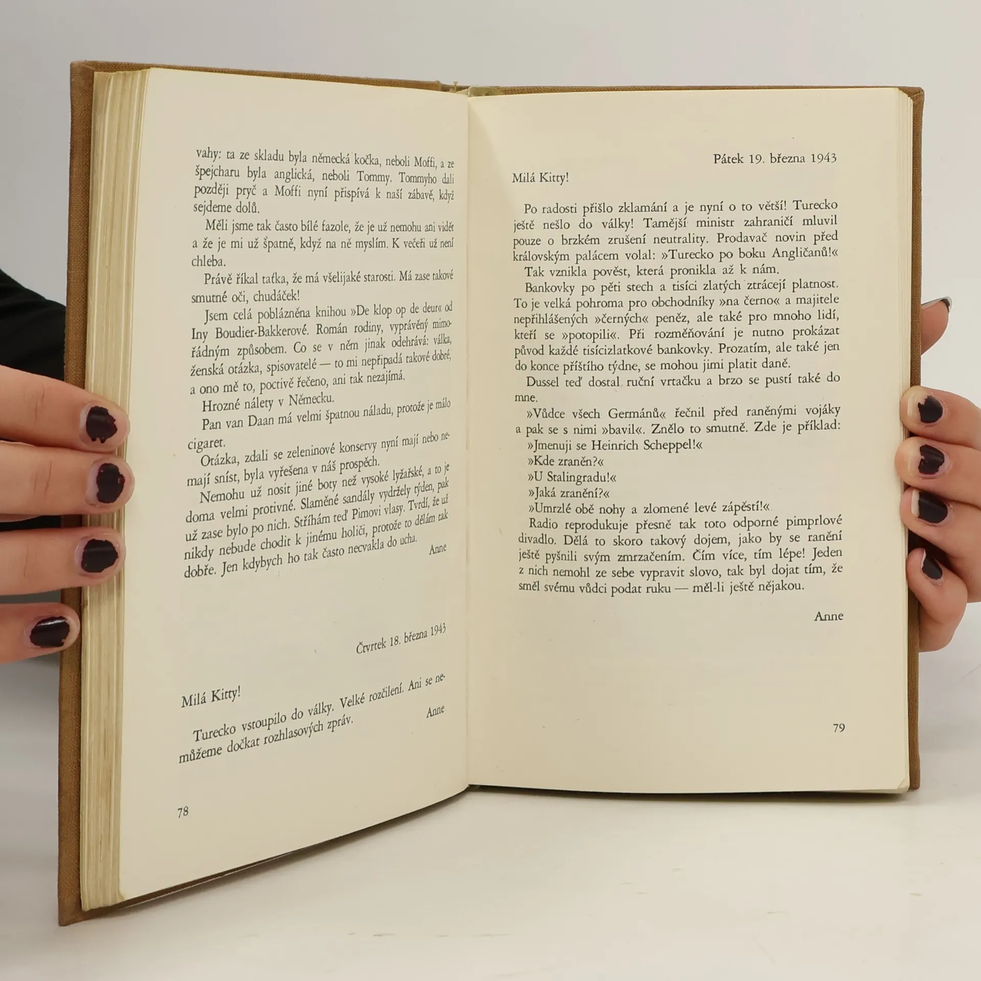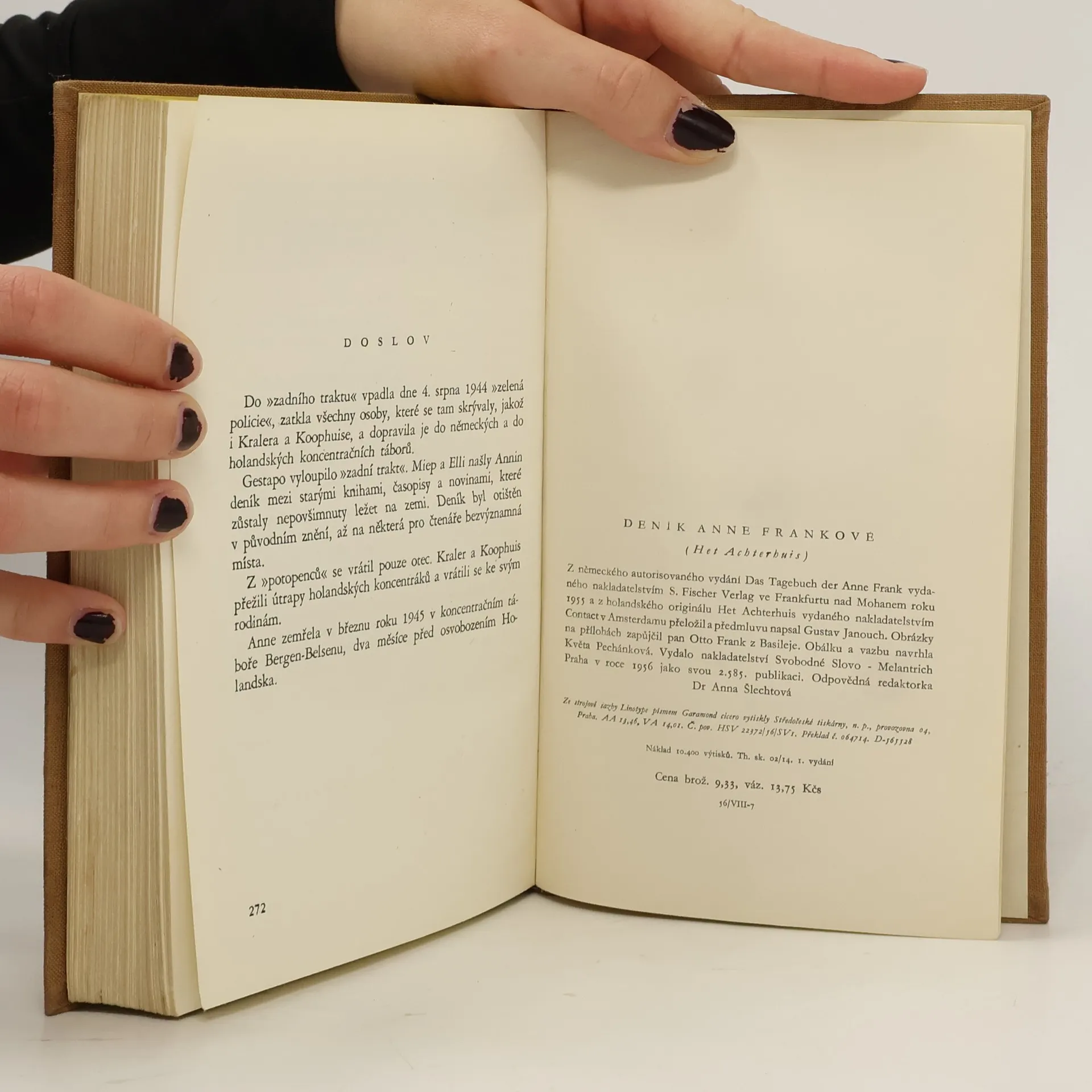 Dospívající Anne psala od 12. června 1942 do 4. srpna 1944 deník. Po prozrazení skrýše byla rodina odvezena do koncentračních táborů v Německu, přežil jen otec. Anne zahynula v Bergen-Belsenu. Po válce otec deník vydal, byl přeložen do mnoha jazyků a zdramatizován. Toto české vydání obsahuje poprvé nově nalezené a dosud nepublikované stránky.