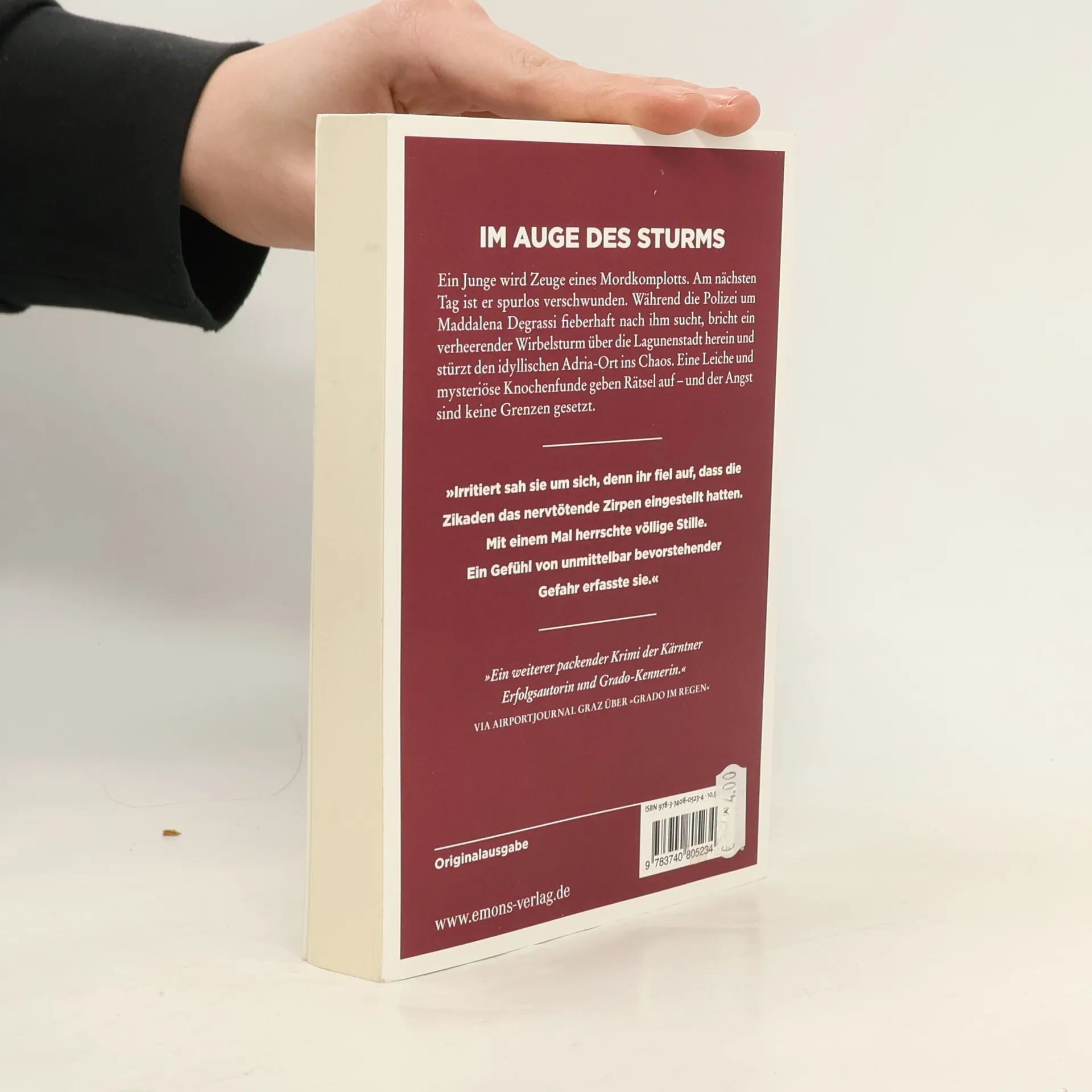 Im Auge des Sturms Ein Junge wird Zeuge eines Mordkomplotts. Am nächsten Tag ist er spurlos verschwunden. Während die Polizei um Maddalena Degrassi fieberhaft nach ihm sucht, bricht ein verheerender Wirbelsturm über die Lagunenstadt herein und stürzt den idyllischen Adria-Ort ins Chaos. Eine Leiche und mysteriöse Knochenfunde geben Rätsel auf – und der Angst sind keine Grenzen gesetzt.