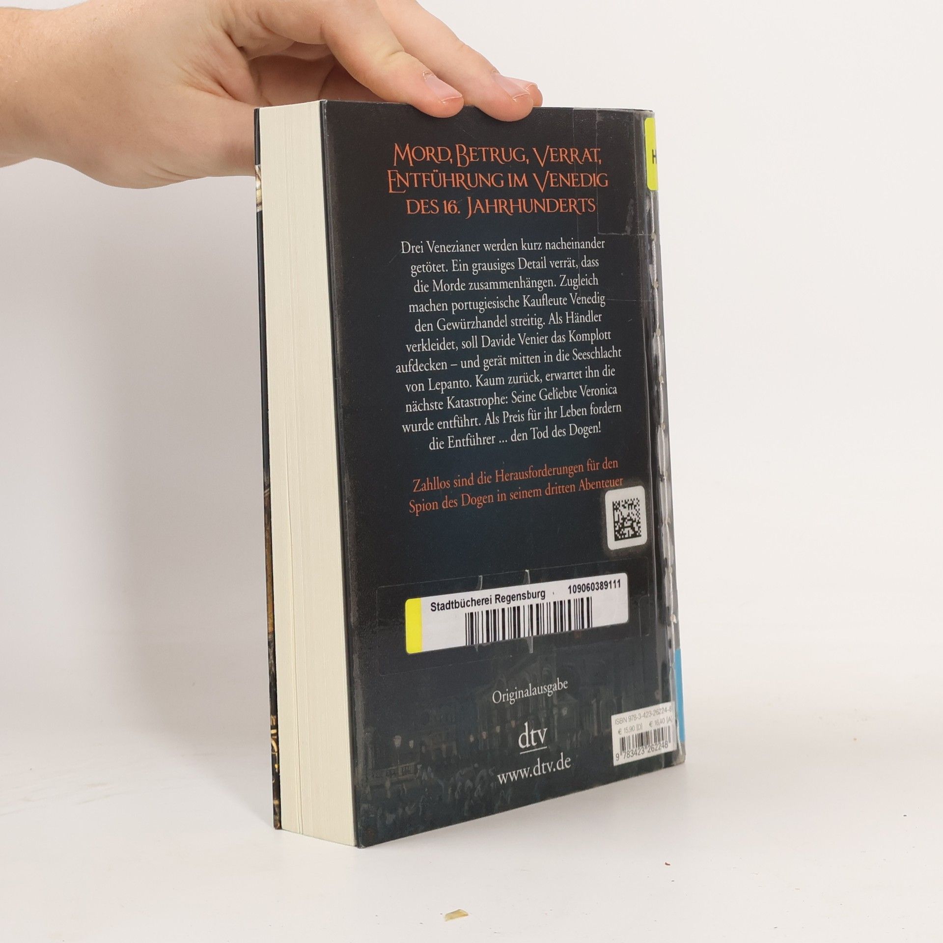 Der Spion des Dogen in Bestform Davide Venier auf Spurensuche: Drei Venezianer werden innerhalb kürzester Zeit ermordet. Ein grausiges Detail, zwei gebrochene und ineinander verschlungene Finger, verrät, dass die Morde zusammenhängen. Währenddessen machen portugiesische Kaufleute Venedig den Gewürzhandel streitig. Auch hier ist Davides Einsatz gefragt: Als Händler verkleidet soll er die Verschwörung aufdecken – und gerät mitten in die Seeschlacht von Lepanto. Kaum zurück, erwartet ihn ein neues Albtraum-Szenario: Seine Geliebte Veronica wurde entführt. Als Preis für ihr Leben fordern die Entführer ... den Tod des Dogen!