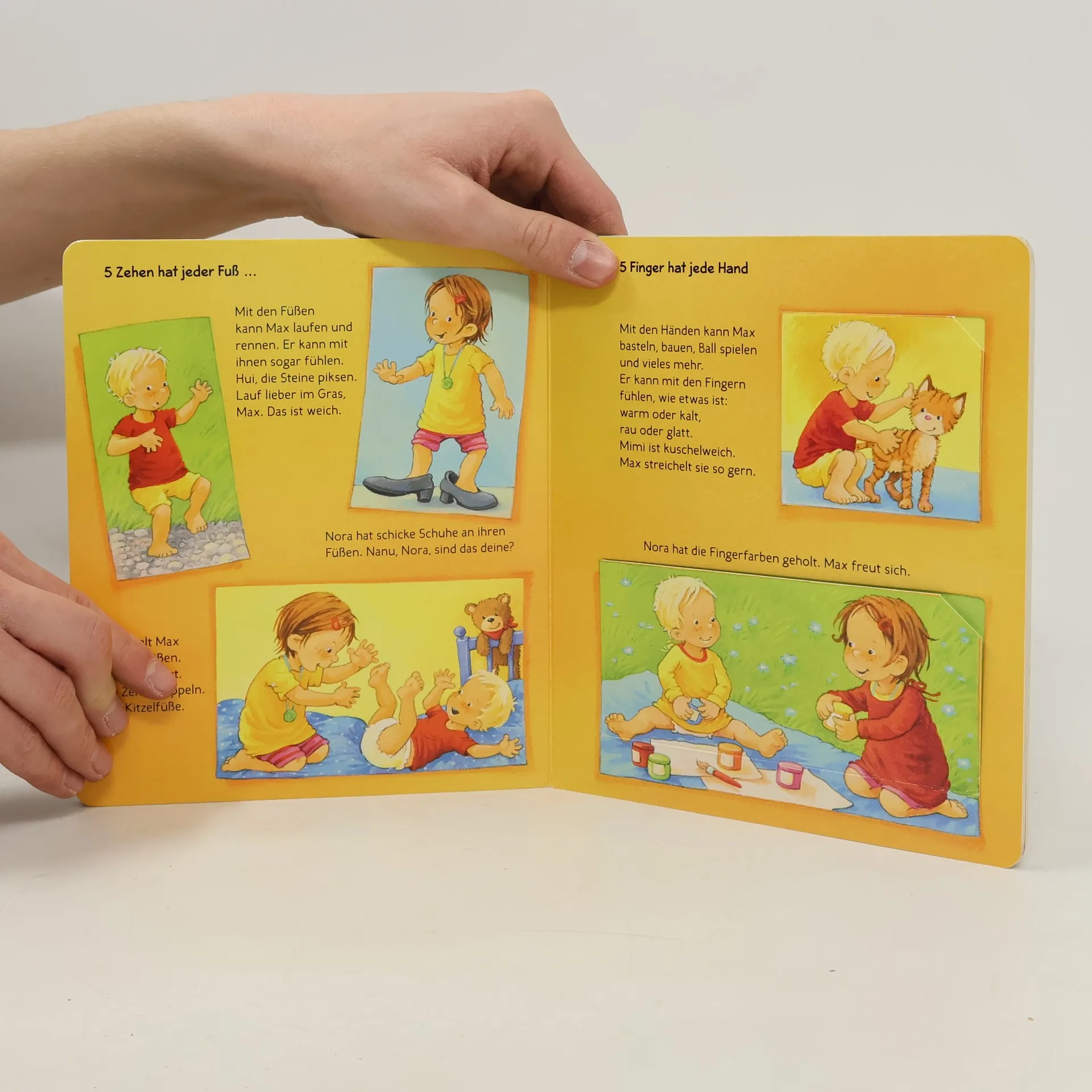 Max und seine Schwester Nora sind zwei Kinder, die zwar viele Gemeinsamkeiten haben, aber auch Unterschiede aufweisen. Dieses Buch richtet sich an Kinder ab 2 Jahren und erklärt auf spielerische Weise den eigenen Körper. Es benennt verschiedene Körperteile und thematisiert die Sinne sowie Gefühle. Die vielen spannenden Klappen sorgen für Entdeckungsfreude und machen das Lernen unterhaltsam. Der auffällige Gummibauch auf dem Cover zieht die Aufmerksamkeit auf sich und lädt zum Fühlen ein. Kinder erfahren, was es bedeutet, die Welt durch Sehen, Fühlen, Hören und Schmecken zu erleben, und lernen, verschiedene Emotionen wie Traurigkeit, Freude und Wut zu erkennen. Kurze Texte und abwechslungsreiche Klappen auf jeder Seite erleichtern das Verständnis und machen die Erklärungen anschaulich. Dieses Buch ist ideal, um den Kleinen auf lustige Art und Weise viel Wissenswertes über ihren Körper näherzubringen und ihre Neugier zu wecken.