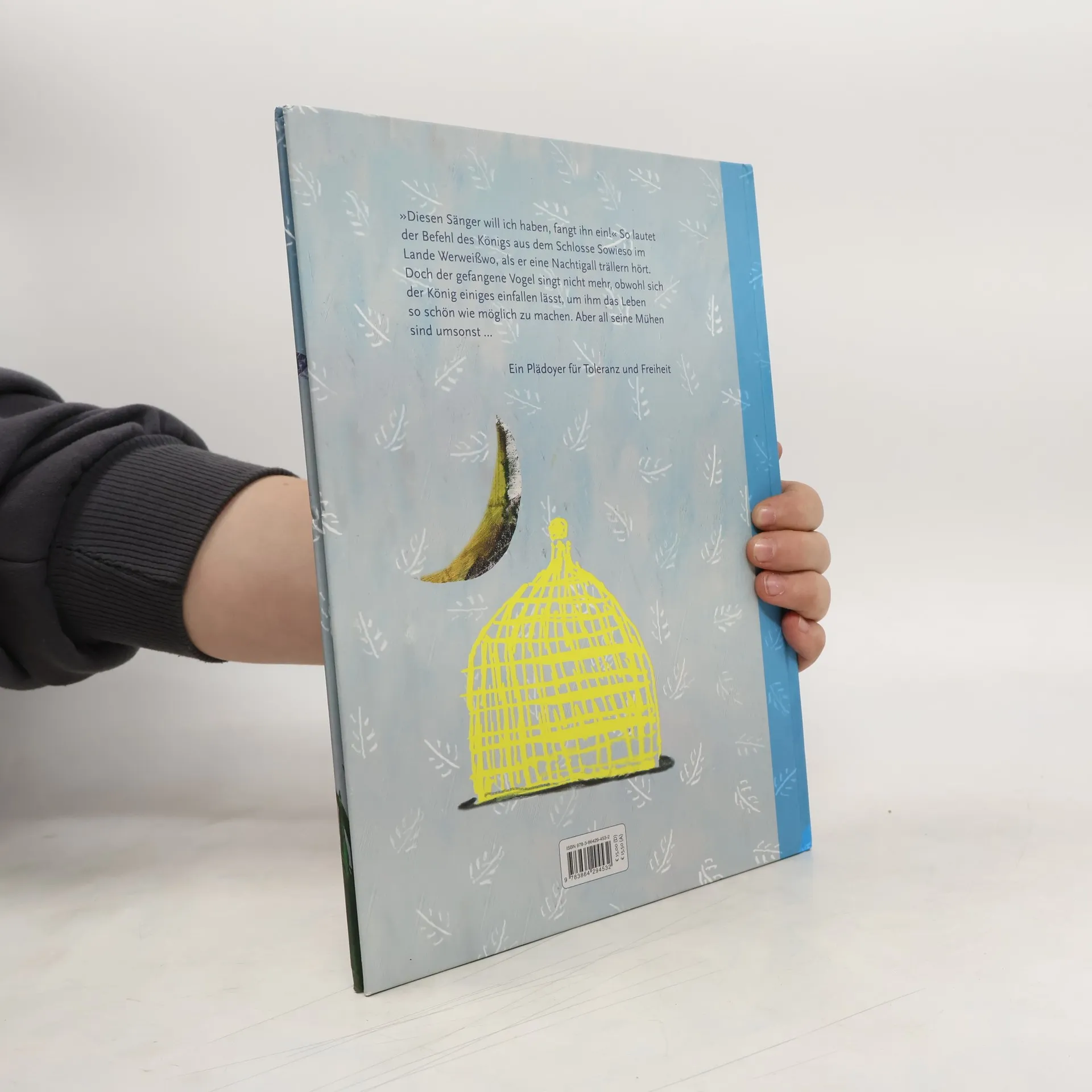 »Diesen Sänger will ich haben, fangt ihn ein!« So lautet der Befehl des Königs aus dem Schlosse Sowieso im Lande Werweißwo, als er eine Nachtigall trällern hört. Doch der gefangene Vogel singt nicht mehr, obwohl sich der König so manches einfallen lässt, um ihm das Leben so schön wie möglich zu machen: ein goldener Käfig, ein reich verziertes Samtkleid, königliche Speisen, ja sogar einen Hofball gibt er für die edle Nachtigall. Doch all seine Mühen sind umsonst: Die Nachtigall erträgt das Leben in Gefangenschaft nicht und stirbt. Und so sieht schließlich auch der König die große Wahrheit ein: Jeder muss selbst entscheiden können, wie er leben möchte. Ausstattung: durchgehend farbig illustriert