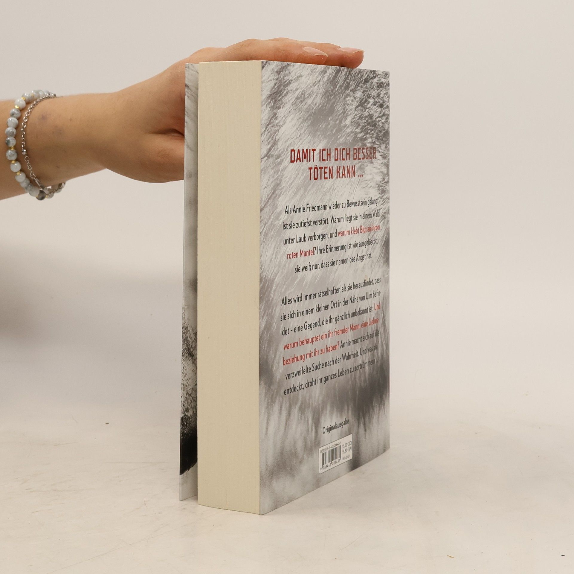 Als Annie Friedmann wieder zu Bewusstsein gelangt, ist sie zutiefst verstört. Warum liegt sie in einem Wald, unter Laub verborgen? Wie ist sie hierher gekommen, und warum klebt Blut an ihrem roten Mantel? Ihre Erinnerung ist wie ausgelöscht, sie weiß nur, dass sie namenlose Angst hat. Alles wird immer rätselhafter, als sie herausfindet, dass sie sich in einem kleinen Ort in der Nähe von Ulm befindet – eine Gegend, die ihr gänzlich unbekannt ist. Und warum behauptet ein ihr fremder Mann, eine Liebesbeziehung mit ihr zu haben? Annie macht sich auf die verzweifelte Suche nach der Wahrheit. Und was sie entdeckt, droht ihr ganzes Leben zu zertrümmern ...