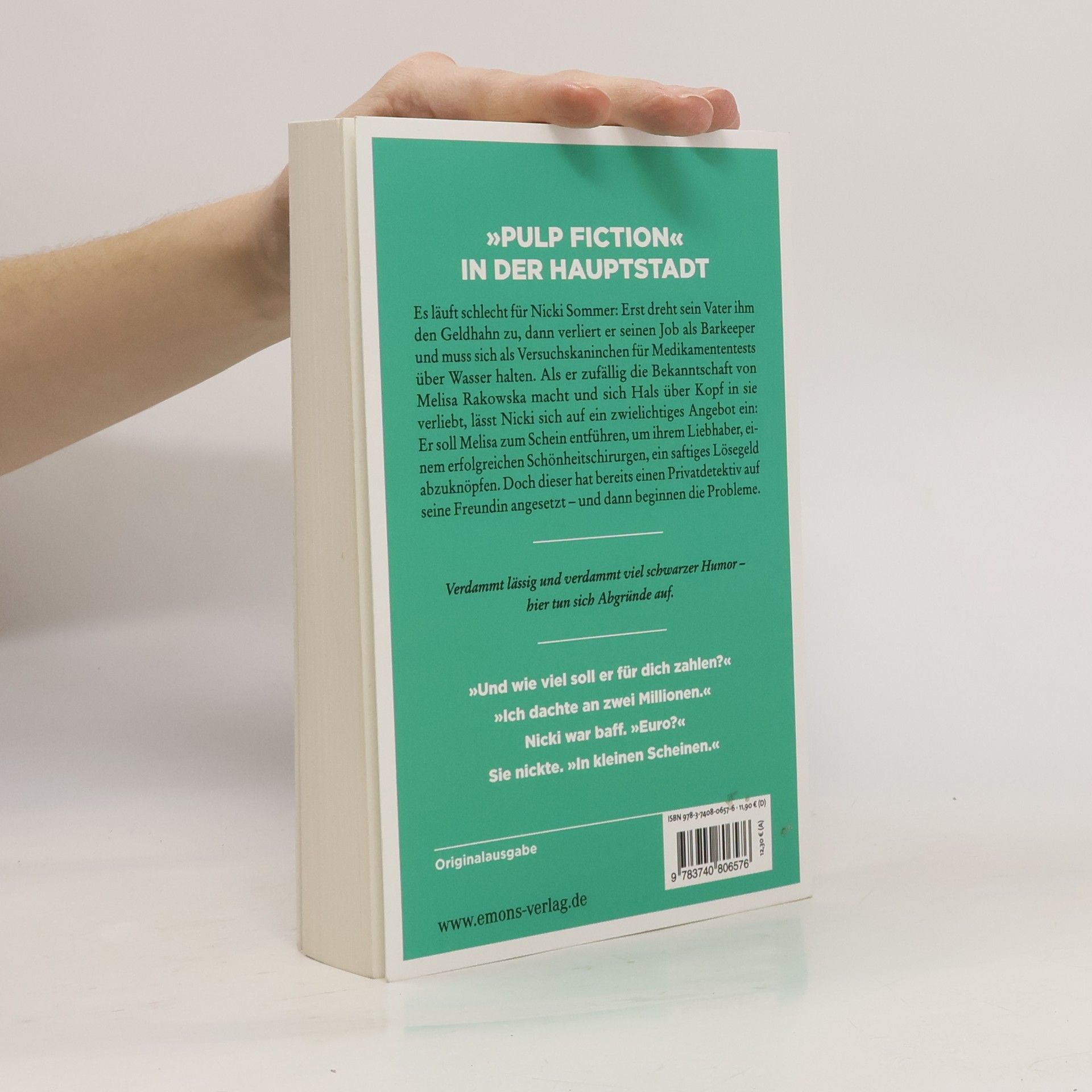 „Pulp Fiction“ in der Hauptstadt Es läuft schlecht für Nicki Sommer: Erst dreht sein Vater ihm den Geldhahn zu, dann verliert er seinen Job als Barkeeper und muss sich als Versuchskaninchen für Medikamententests über Wasser halten. Als er zufällig die Bekanntschaft von Melisa Rakowska macht und sich Hals über Kopf in sie verliebt, lässt Nicki sich auf ein zwielichtiges Angebot ein: Er soll Melisa zum Schein entführen, um ihrem Liebhaber, einem erfolgreichen Schönheitschirurgen, ein saftiges Lösegeld abzuknöpfen. Doch dieser hat bereits einen Privatdetektiv auf seine Freundin angesetzt – und dann beginnen die Probleme. Nominiert für den GLAUSER-Preis 2020 in der Sparte »Debüt« »Die actionreiche Geschichte lebt von den schrägen Charakteren und den coolen Dialogen. Die Geschichte überzeugt außerdem mit verblüffenden Wendungen, durch die bis zum Schluss die Spannung gehalten wird. Auch wenn sich ein Mord an den anderen reiht, folgt man der rasanten und skurrilen Story mit großem Vergnügen.« (Aus der Jury-Begründung)