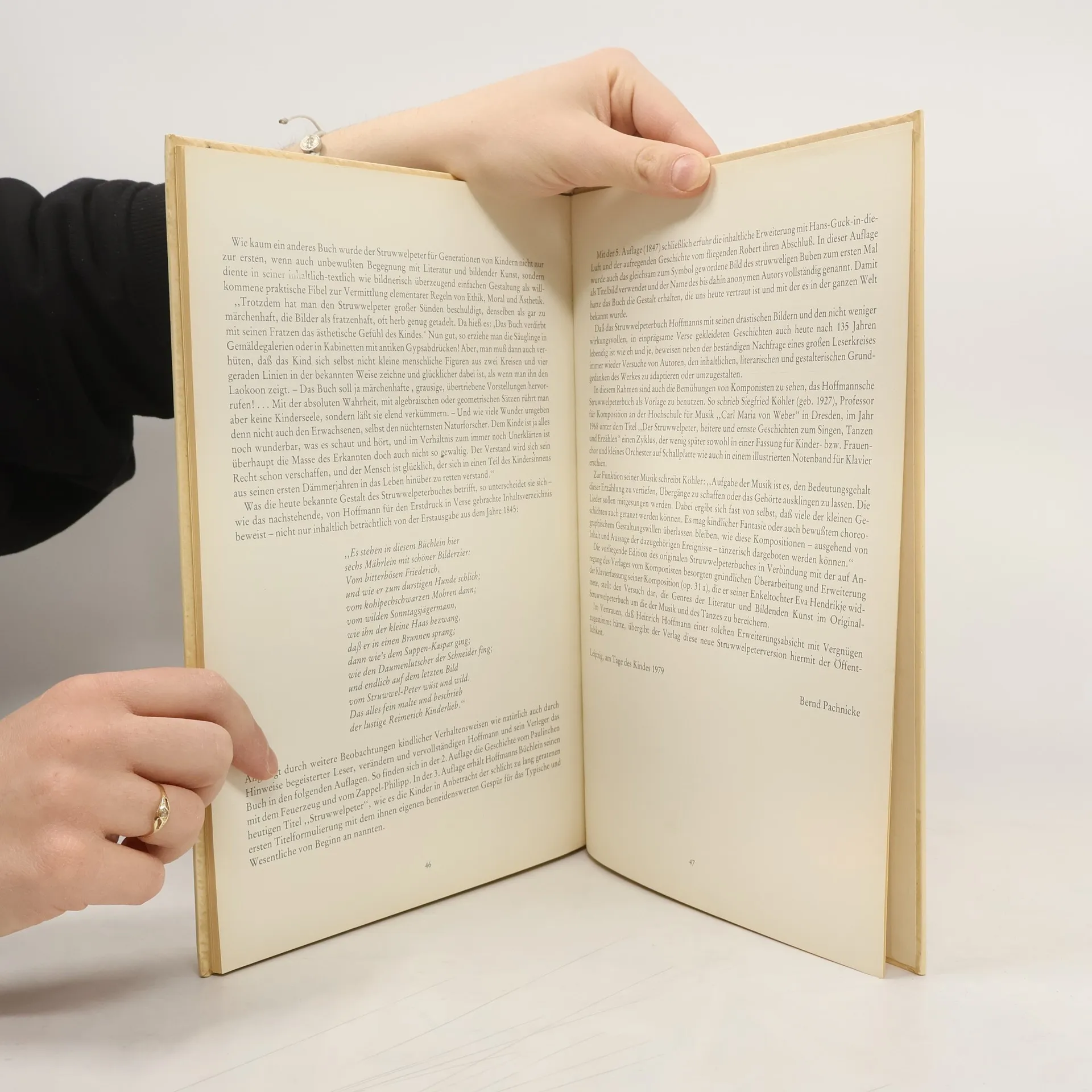 1844 suchte der Arzt Heinrich Hoffmann ein Bilderbuch als Weihnachtsgeschenk für seinen dreijährigen Sohn Carl, fand jedoch nichts Passendes. In der Zeitschrift „Gegen“ beschreibt Hoffmann, dass er lange Erzählungen oder moralische Geschichten vorfand, die nicht für Kinder in diesem Alter geeignet waren. Schließlich kehrte er mit einem leeren Schreibheft zurück und beschloss, ein eigenes Bilderbuch zu erstellen. Das Geschenk kam gut an und erregte das Interesse seiner erwachsenen Freunde, die ihn drängten, das Buch zu veröffentlichen. Zunächst lehnte er ab, doch ein befreundeter Verleger konnte ihn überzeugen. 1845 erschien das Buch erstmals unter dem Titel „Lustige Geschichten und drollige Bilder für Kinder von 3–6 Jahren“, ab der vierten Auflage 1847 als „Struwwelpeter“. Seit 1858 gab es veränderte Darstellungen. Hoffmann erzählte Geschichten über unartige Kinder, die nicht auf ihre Eltern hören und dafür bestraft werden, wie der „bitterböse Friederich“, der Tiere quält, oder Paulinchen, die mit Streichhölzern spielt. Auch positive Geschichten, wie die vom Hasen, der den Jäger überlistet, sind enthalten. Namen wie Zappelphilipp und Suppenkaspar sind in die deutsche Sprache eingegangen, und Textpassagen wie „Konrad“ sprach die Frau Mama, „ich geh aus und Du bleibst da“ sind heute allgemein bekannt.