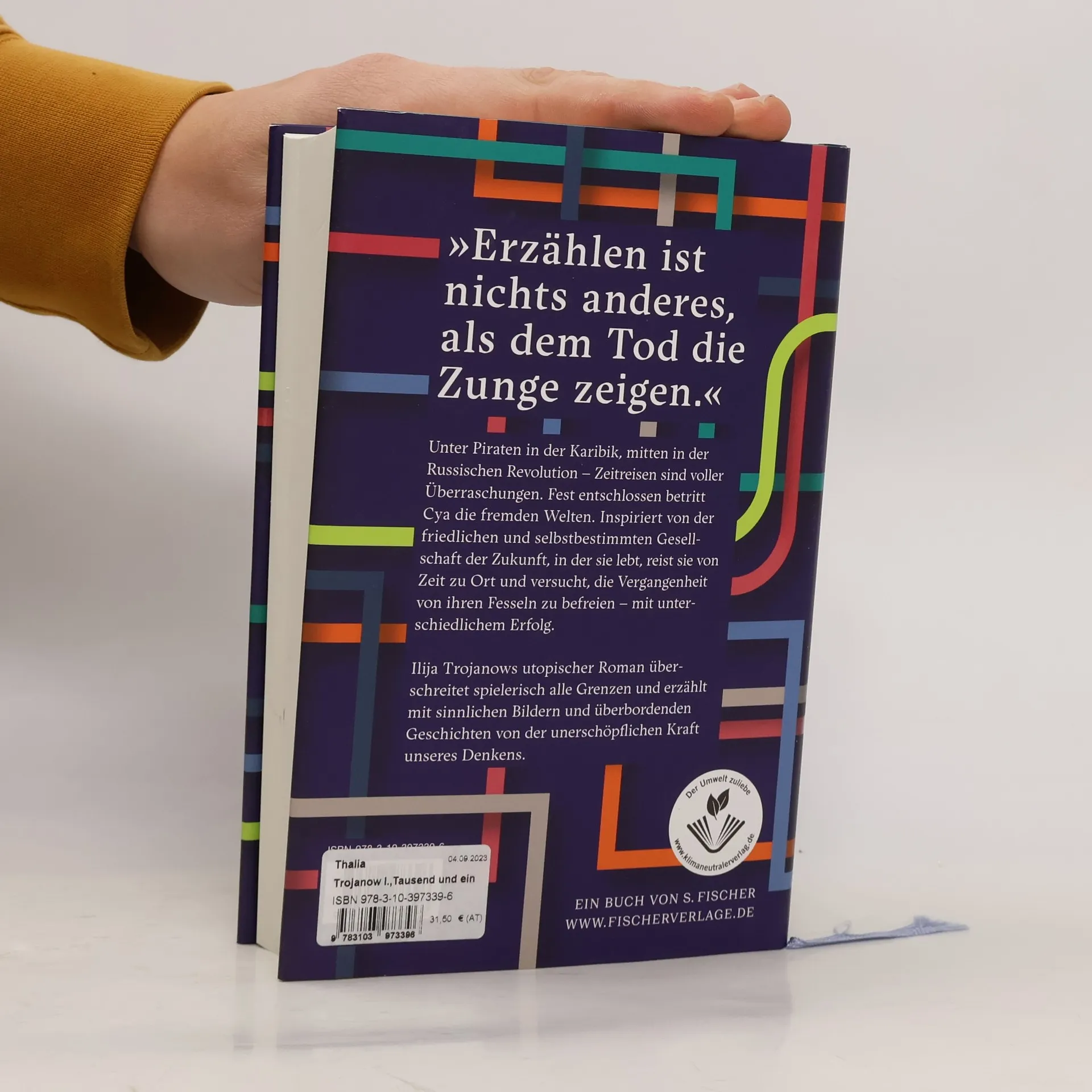 Unter Piraten in der Karibik, mitten in der Russischen Revolution - Zeitreisen sind voller Überraschungen. Fest entschlossen betritt Cya die fremden Welten. Inspiriert von der friedlichen und selbstbestimmten Gesellschaft der Zukunft, in der sie lebt, reist sie von Zeit zu Ort und versucht, die Vergangenheit von ihren Fesseln zu befreien – mit unterschiedlichem Erfolg. In »Tausend und ein Morgen« entwirft Ilija Trojanow ein leidenschaftliches Porträt seiner mutigen Heldin. Wie kein anderer Autor verbindet er erzählerische Virtuosität und kritisches Denken zu einem modernen Epos, das alle Grenzen überwindet, Raum und Zeit ausleuchtet und einen frischen Blick in die Zukunft wagt. Mit sinnlichen Bildern und überbordenden Geschichten erfindet Ilija Trojanow den utopischen Roman neu - ein Roman, der von der unerschöpflichen Kraft unseres Denkens erzählt.