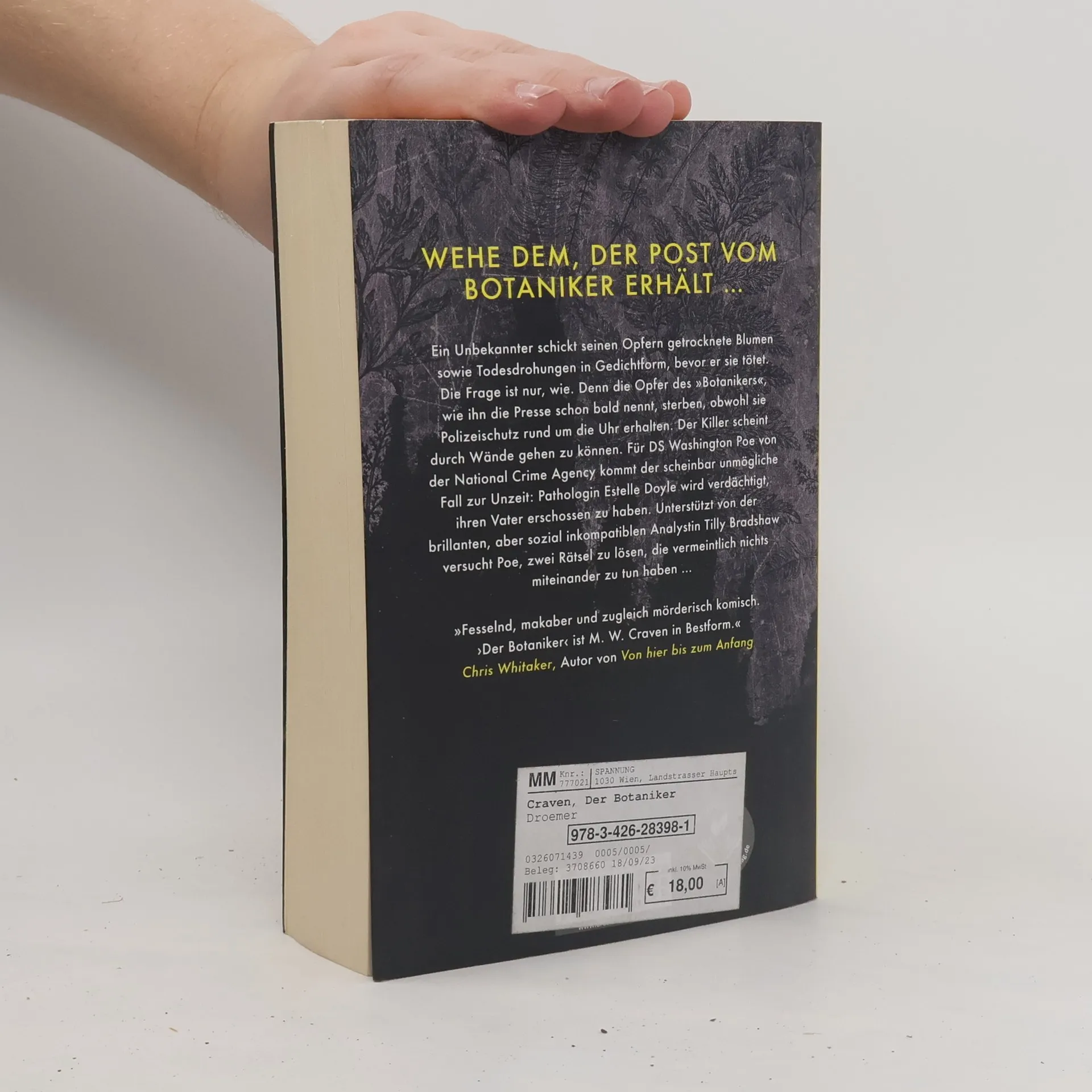 Die Top-Weihnachtsempfehlung: »Wer für dieses Jahr Spannung verschenken will - M. W. Craven „Der Botaniker“. Eine absolute Entdeckung!« Buchhandlung Belling, Lübeck Getrocknete Blumen, Gedichte – und Gift: Wehe dem, der Post vom Botaniker erhält … Der clevere Krimi des britischen Bestseller-Autors M. W. Craven begeistert mit einem Ermittler-Team voller Frauen-Power, gleich zwei scheinbar unlösbaren Rätseln und typisch englischem Humor. Clever und hochspannend - ein Mystery-Meisterwerk Er schickt seinen Opfern Gedichte und getrocknete Blumen, bevor er sie vergiftet – und er kann offenbar durch Wände gehen, denn selbst Polizeischutz rund um die Uhr kann ihn nicht stoppen.