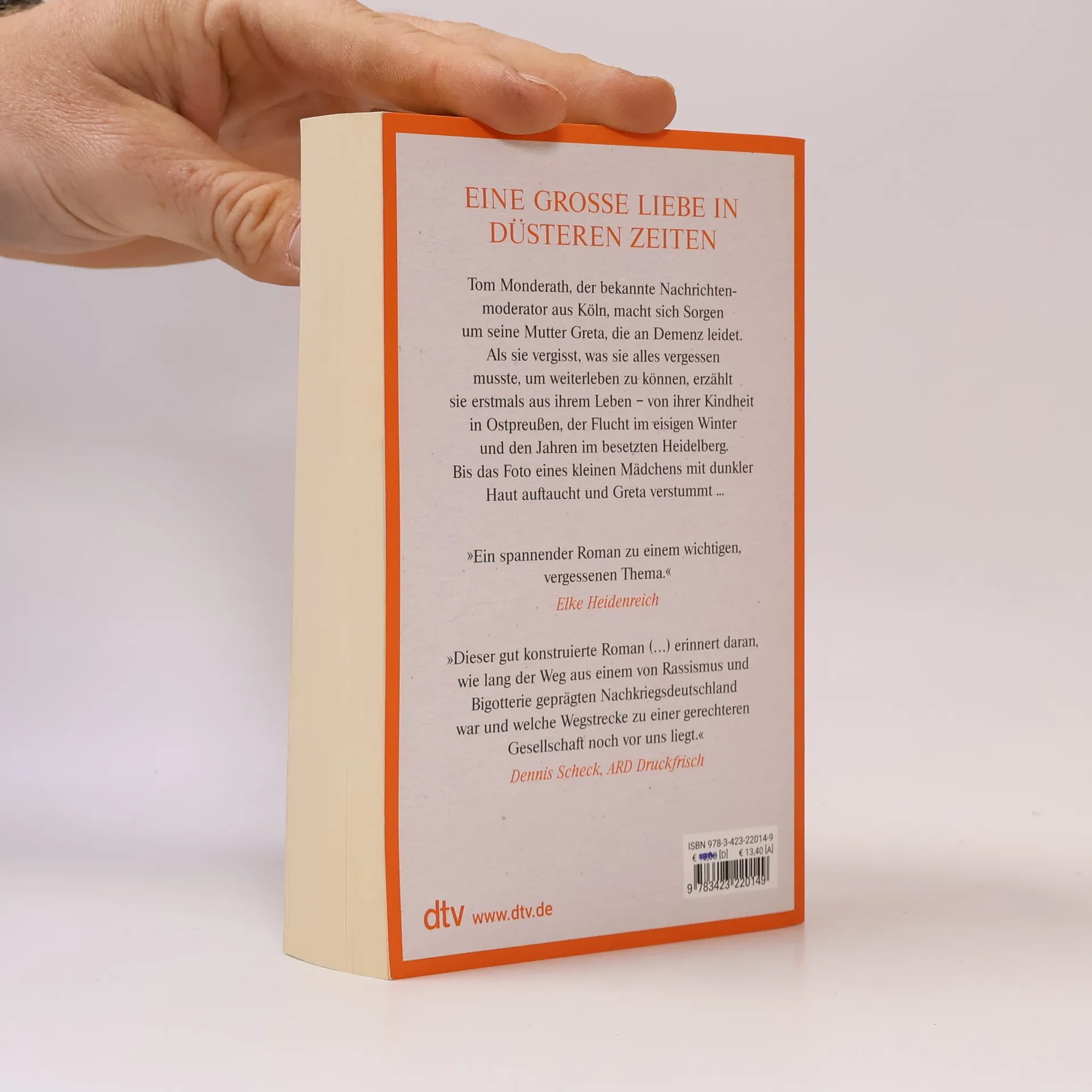Eine große Liebe in düsteren Zeiten ist ein bemerkenswertes Debüt und ein generationsübergreifender Familienroman. Der Kölner Nachrichtenmoderator Tom Monderath ist besorgt um seine 84-jährige Mutter Greta, die zunehmend vergesslich wird. Als die Diagnose Demenz im Raum steht, ist Tom erschüttert. Doch die Krankheit wird zu einem Geschenk, als Greta beginnt, von ihrem Leben zu erzählen – von ihrer Kindheit in Ostpreußen, ihren geliebten Großeltern, der Flucht vor den russischen Soldaten im Winter und ihrer Zeit im besetzten Heidelberg. Als Tom jedoch ein Foto eines kleinen Mädchens mit dunkler Haut entdeckt, verstummt Greta. Dies führt Tom dazu, sich intensiver mit der Vergangenheit seiner Mutter auseinanderzusetzen, um ihre Traurigkeit zu verstehen und sein eigenes Glück zu finden. Nichts bleibt für immer vergessen – die Autorin schreibt hochemotional, klug und einfühlsam. Der Roman thematisiert wichtige, oft vergessene Aspekte der Geschichte und reflektiert über den langen Weg aus einem von Rassismus und Bigotterie geprägten Nachkriegsdeutschland.