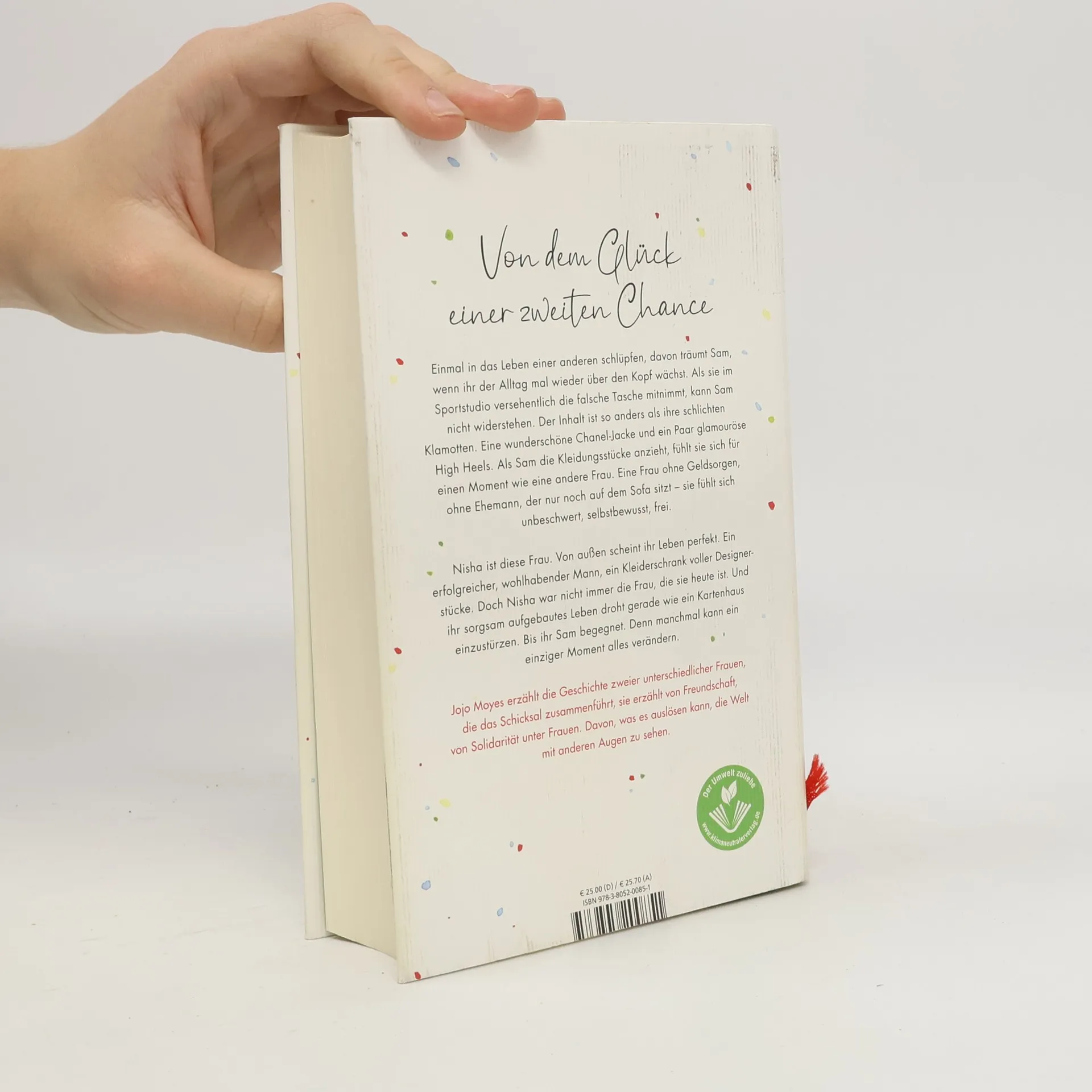 Mit «Ein ganzes halbes Jahr» hat Jojo Moyes Millionen Leser: innen-Herzen erobert. Ihre Romane sind unvergleichlich, lassen uns mitfühlen, bringen uns zum Weinen und zum Lachen. In ihrem neuen Roman erzählt Jojo Moyes die Geschichte zweier ungleicher Frauen, die das Schicksal zusammenführt. Einmal in das Leben einer anderen schlüpfen, davon träumt Sam, wenn ihr der Alltag mal wieder über den Kopf wächst. Als sie im Sportstudio versehentlich die falsche Tasche mitnimmt, kann sie nicht widerstehen. Der Inhalt ist so anders als ihre schlichten Klamotten. Eine wunderschöne Chanel-Jacke und ein Paar glamouröse High Heels. Als Sam die Kleidungsstücke anzieht, fühlt sie sich für einen Moment wie eine andere Frau. Eine Frau ohne Geldsorgen, ohne Ehemann, der nur noch auf dem Sofa sitzt - sie fühlt sich unbeschwert, selbstbewusst, frei. Nisha ist diese Frau. Von außen scheint ihr Leben perfekt. Ein erfolgreicher, wohlhabender Mann, ein Kleiderschrank voller Designerstücke. Doch Nisha war nicht immer die Frau, die sie heute ist. Und ihr sorgsam aufgebautes Leben droht gerade wie ein Kartenhaus einzustürzen. Bis ihr Sam begegnet. Denn manchmal kann ein einziger Moment alles verändern. Jojo Moyes erzählt die Geschichte von Sam und Nisha, sie erzählt von Freundschaft, von Solidarität unter Frauen. Davon, was es auslösen kann, die Welt mit anderen Augen zu sehen. Und von dem Glück einer zweiten Chance.