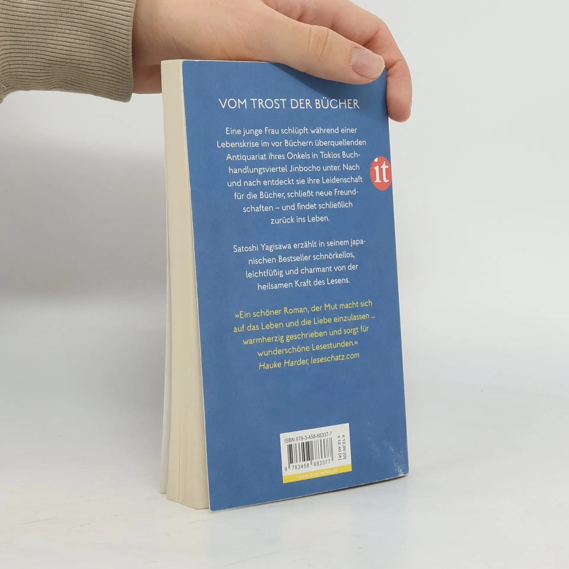 Satoshi Yagisawa erzählt in seinem Bestseller schnörkellos, leichtfüßig und charmant von einer jungen Frau, die durch die heilsame Kraft des Lesens zurück ins Leben und zu neuen Freundschaften findet. Die 25-jährige Takako hat einen Job, eine Wohnung in Tokio und einen festen Freund. Als dieser ihr eines Abends freudig eröffnet, er werde heiraten – und zwar eine andere –, fällt sie aus allen Wolken. Vor Kummer verkriecht sie sich und kündigt ihren Job. Als ihr Onkel ihr anbietet, eine Zeitlang in seinem Antiquariat im berühmten »Bücherviertel« Tokios, Jimbōchō, auszuhelfen und dort auch unterzukommen, findet sie das zwar zunächst alles andere als reizvoll, willigt aber ein. Doch in dem kleinen Zimmer über dem Laden, inmitten von Büchern, entdeckt sie ihre Leidenschaft fürs Lesen – und schöpft allmählich wieder neue Kraft.