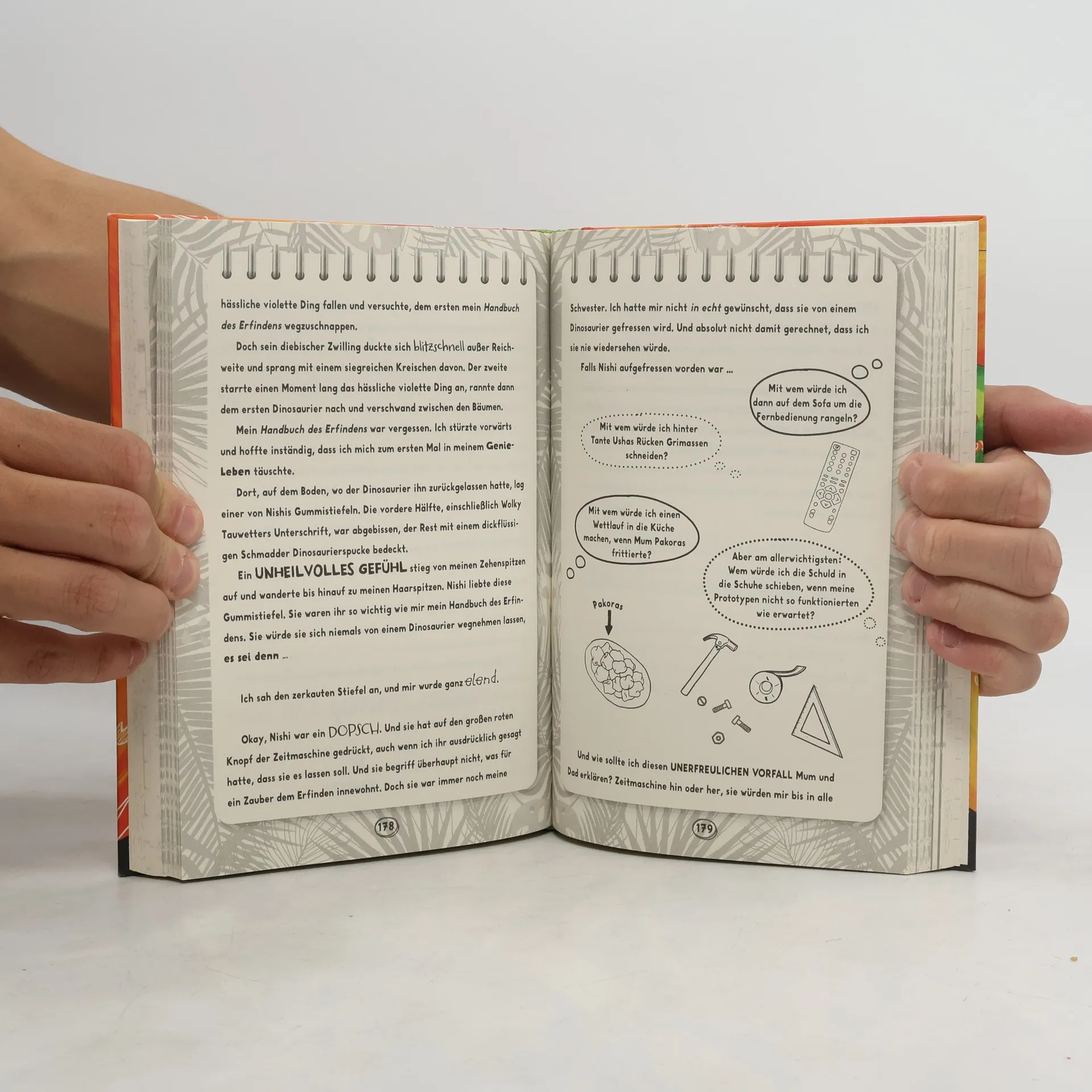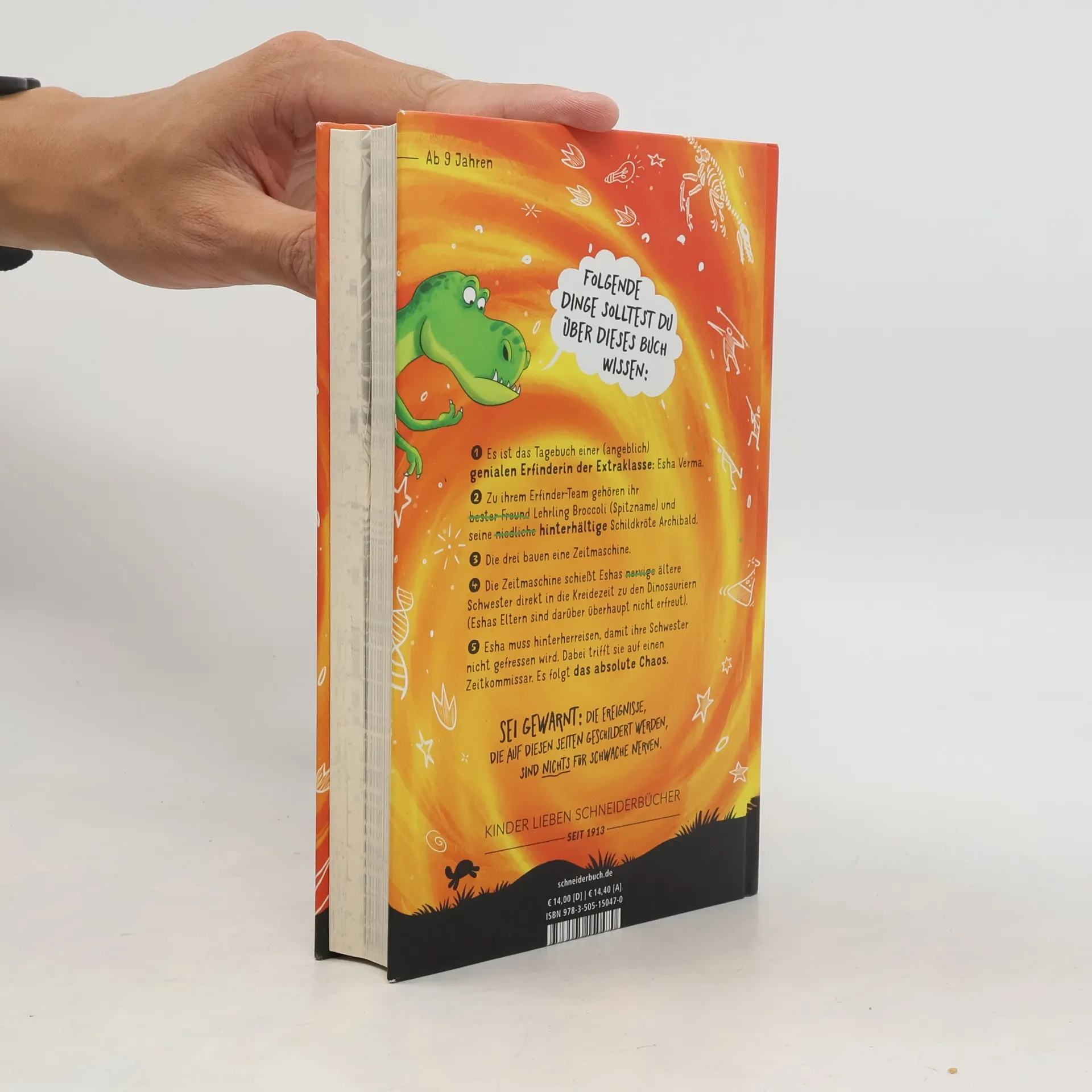 Hilfe, meine Schwester ist bei den Dinosauriern gelandet! Esha Verma, ihr Lehrling Broccoli und seine schlaue Haustierschildkröte haben einen Traum: Sie wollen den legendären Hirni-Pokal gewinnen – den ultimativen Erfinderpreis. Der diesjährige Beitrag: EINE ZEITMASCHINE. Aber am Tag vor dem Wettkampf entführt Eshas große Schwester die Zeitmaschine und verirrt sich in die Kreidezeit. Nun müssen Esha und Broccoli sich hungrigen Dinosauriern, mysteriösen schwarzen Löchern und fehlerhaften Erfindungen stellen, um Eshas Schwester wieder zurückzuholen. Immerhin ist schon jetzt bewiesen, dass die Zeitmaschine funktioniert. Hoffentlich sehen das auch die Wettkampfrichter so ... Abwechslungsreich gestaltet in Notizblock-Optik, mit vielen Kritzeleien und Illustrationen