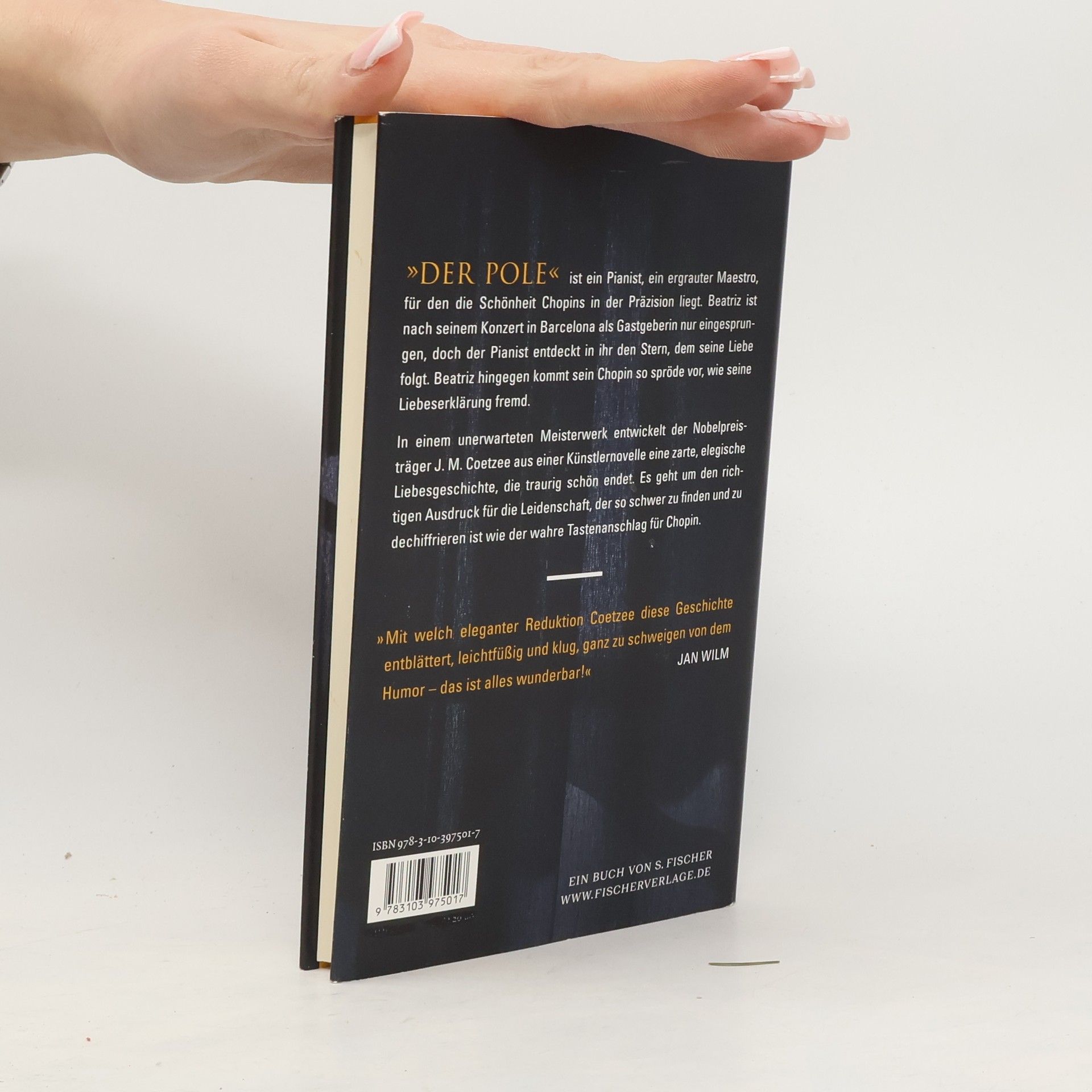 In seiner Künstlernovelle »Der Pole« entwirft der Nobelpreisträger J. M. Coetzee eine zarte, elegische Liebesgeschichte, die spröde beginnt und traurig schön endet. Der Protagonist, ein ergrauter Maestro, ist Pianist, für den die Schönheit Chopins in der Präzision liegt. Beatriz ist nach seinem Konzert in Barcelona als Gastgeberin nur eingesprungen, doch der Pianist entdeckt in ihr den Stern, dem seine Liebe folgen will. Beatriz kommen seine Interpretationen von Chopins Nocturnes etwas reizlos vor und seine Liebeserklärung in Form eines Gedicht-Zyklus in einer fremden Sprache stellt sie vor die Herausforderung deren Bedeutung erst mühsam dechiffrieren zu müssen. Dennoch entwickelt sich zwischen beiden eine Liebesbeziehung, die die Schwierigkeif aufzeigt, wahre Gefühle zu übermitteln. In einem wahren Meisterwerk entwickelt J. M. Coetzee eine Erzählung, in der es um den richtigen Ausdruck für die Leidenschaft geht, der den anderen überzeugt und so schwer zu finden ist wie der wahre Tastenanschlag für Chopin. Mit der Erkenntnis, dass man ihn manchmal auch zu spät erst findet… »Mit welch eleganter Reduktion Coetzee diese Geschichte entblättert, leichtfüßig und klug, ganz zu schweigen von dem Humor – das ist alles wunderbar!« Jan Wilm »Eine Sprache, die sich auf die kleinen Dinge des Lebens konzentriert.« Marie-Luise Knott, Deutschlandfunk, zu »Ein Haus in Spanien«