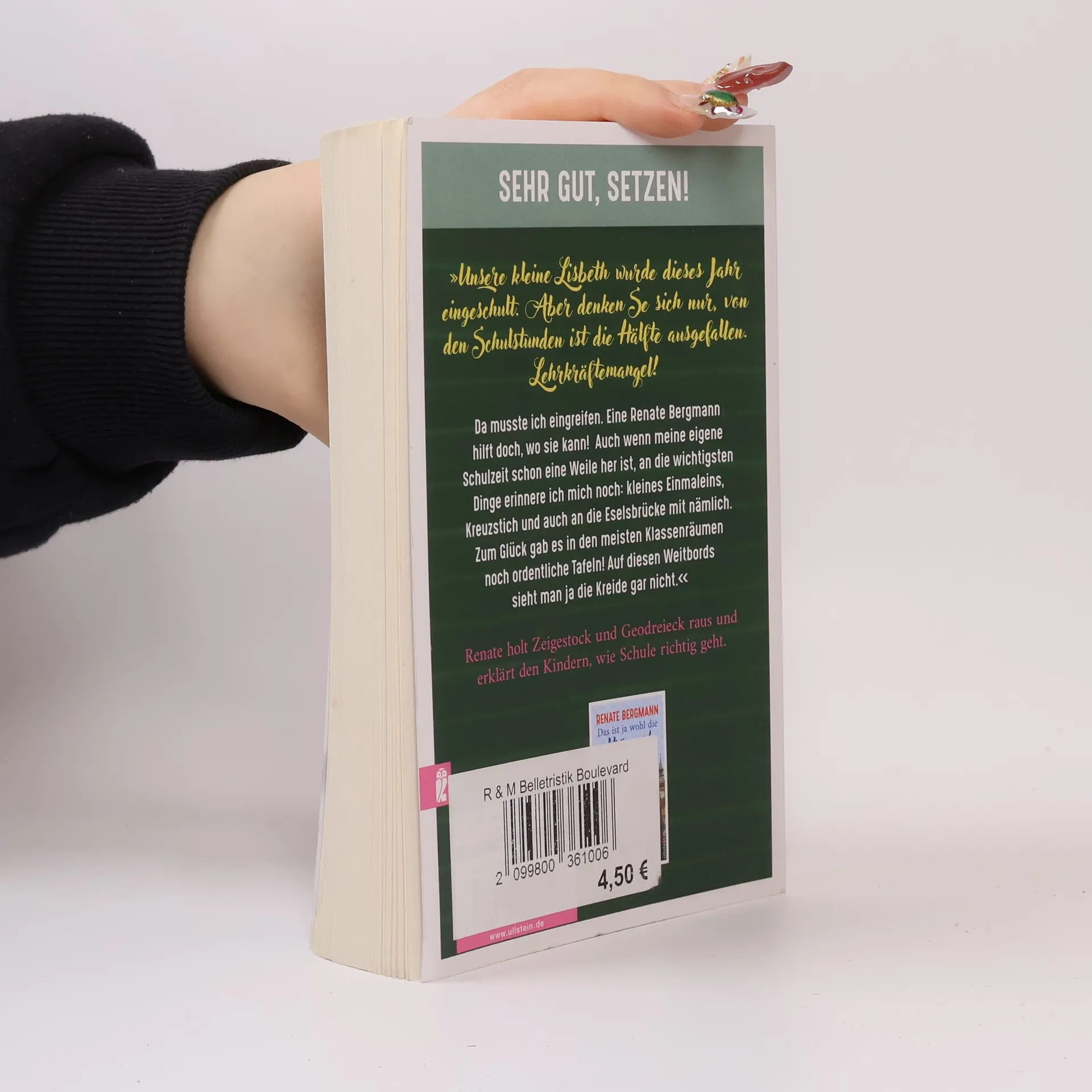 Sehr gut, setzen! »Unsere kleine Lisbeth, was die Tochter von meinem Neffen Stefan ist, wurde dieses Jahr eingeschult. Aber denken Se sich nur, von den Schulstunden ist die Hälfte ausgefallen. Lehrkräftemangel! Ariane war ganz außer sich vor Sorge, dass das Kind auf der Strecke bleibt. Dabei ist die Kleine wirklich schlauer als zum Beispiel der Jemie-Dieter von meiner Nachbarin Frau Berber. Der hat sogar schon einen blauen Brief bekommen, aber das liegt daran, dass die Berber mit ihm die Hausaufgaben macht – und die ist nicht gerade die hellste Lampe im Laden. Na, jedenfalls musste man da eingreifen. Die reden von sozialem Pflichtjahr – aber warum eigentlich nur für die Jungen? Und die Rente soll es jetzt sogar erst mit 70 geben, denken Se das mal! Ich bin schon mit 60 in Pension gegangen! Da ist es besser, wenn ich noch was nacharbeite, bevor die mir draufkommen. Eine Renate Bergmann hilft doch, wo sie kann! Auch wenn meine eigene Schulzeit schon eine Weile her ist, an die wichtigsten Dinge erinnere ich mich noch: kleines Einmaleins, Kreuzstich und auch an die Eselsbrücke mit nämlich. Zum Glück gab es in den meisten Klassenräumen noch ordentliche Tafeln! Auf diesen Weitbords sieht man ja die Kreide gar nicht.« Renate holt Zeigestock und Geodreieck raus und erklärt den Kindern, wie Schule richtig geht.