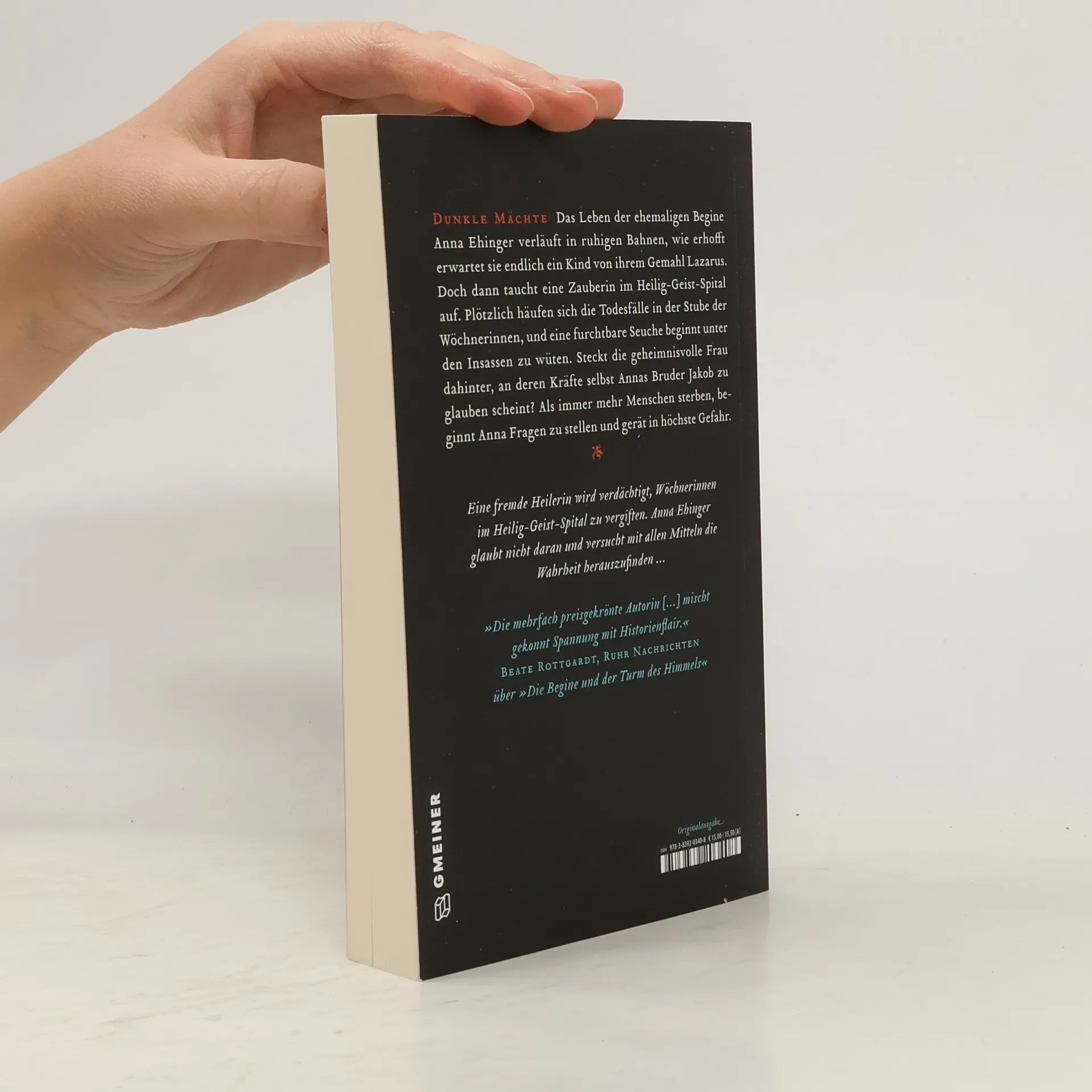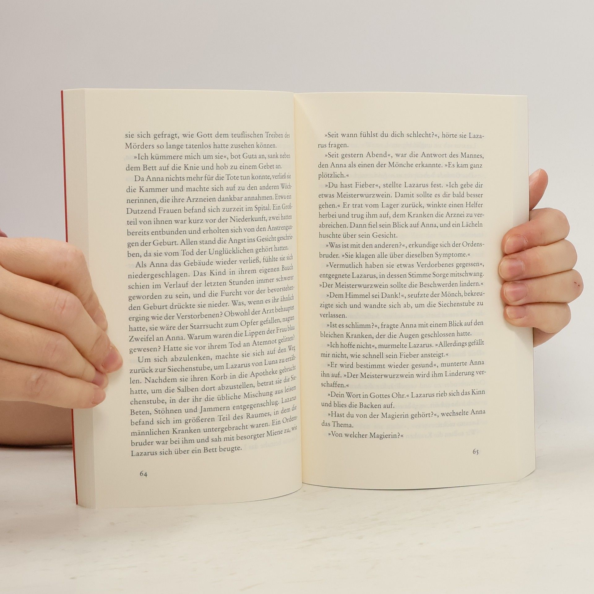 Das Leben der ehemaligen Begine Anna Ehinger verläuft in ruhigen Bahnen, wie erhofft erwartet sie endlich ein Kind von ihrem Gemahl Lazarus. Doch dann taucht eine Zauberin im Heilig-Geist-Spital auf. Plötzlich häufen sich die Todesfälle in der Stube der Wöchnerinnen, und eine furchtbare Seuche beginnt unter den Insassen zu wüten. Steckt die geheimnisvolle Frau dahinter, an deren Kräfte selbst Annas Bruder Jakob zu glauben scheint? Als immer mehr Menschen sterben, beginnt Anna Fragen zu stellen und gerät in höchste Gefahr.