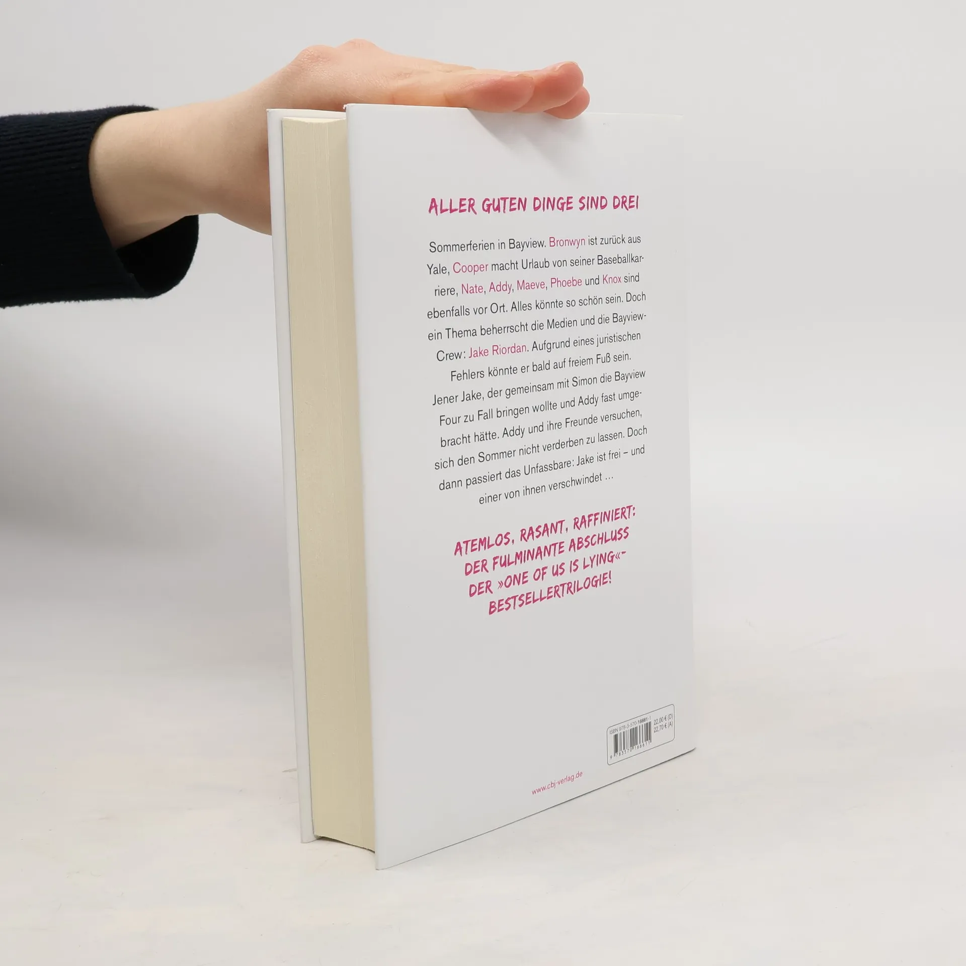 Willkommen zurück in Bayview. Es ist Sommer. Und einer von uns ist wieder da. Sommerferien in Bayview. Addy und ihre Freunde treffen zusammen, um Zeit miteinander zu verbringen: Bronwyn ist zurück aus Yale, Cooper macht Urlaub von seiner Baseballkarriere, Nate, Maeve, Phoebe und Knox sind ebenfalls vor Ort. Alles könnte so entspannt sein. Doch ein Thema beherrscht die Medien und die Bayview-Crew: Aufgrund eines juristischen Fehlers könnte Jake Riordan bald auf freiem Fuß sein und in Berufung gehen. Jener Jake, der mit Simon gegen die Bayview Four intrigierte und Addy fast umgebracht hätte. Addy und ihre Freunde wollen sich den Sommer dennoch nicht verderben lassen. Doch dann ist Jake auf freiem Fuß. Und eine von ihnen verschwindet … Rasant, sexy, umwerfend: der neue raffinierte Thriller von der Weltbestsellerautorin von »One of us is lying«! Mit meisterhaft geplotteten Wendungen und einnehmenden, komplexen Figuren garantieren McManus' Bücher eine Suchtgefahr, der man sich nicht entziehen kann. Weitere Titel der Autorin bei cbj: One of us is lying One of us is next Two can keep a secret The cousins You will be the death of me Nothing more to tell Alle Bücher können unabhängig voneinander gelesen werden.