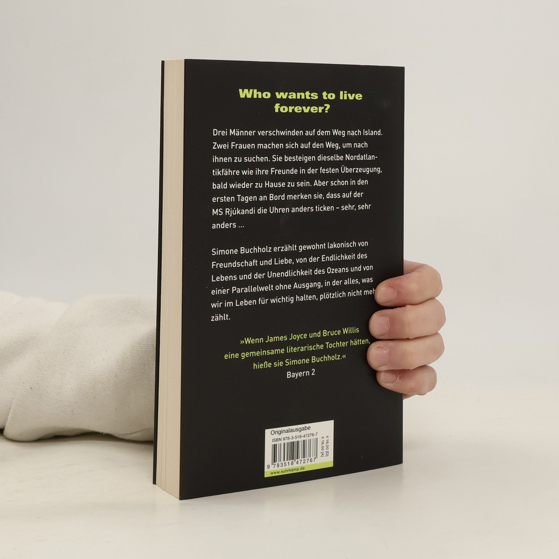 Drei Männer verschwinden spurlos auf der MS Rjúkandi, einer Nordatlantikfähre. Zwei Frauen machen sich auf den Weg, um nach ihren verschollenen Freunden zu suchen – und sie besteigen das Schiff nach Island in der festen Überzeugung, bald wieder zu Hause zu sein. Aber schon in den ersten Tagen an Bord fallen ihnen merkwürdige Dinge auf, und die seltsame Atmosphäre: Die Crew ist überirdisch gutaussehend, der Kapitän scheint bei aller Erhabenheit und Coolness stets einen Sack voll Schuld mit sich herumzuschleppen, und was zur Hölle ist eigentlich mit der Barfrau los? In unnachahmlicher Lakonie erzählt Simone Buchholz von Freundschaft und Liebe, von der Endlichkeit des Lebens und der Unendlichkeit des Ozeans, und von Iva und Malin, die sich plötzlich in einer Parallelwelt ohne Ausgang wiederfinden, in der alles, was sie im Leben für wichtig hielten, plötzlich nicht mehr zählt.