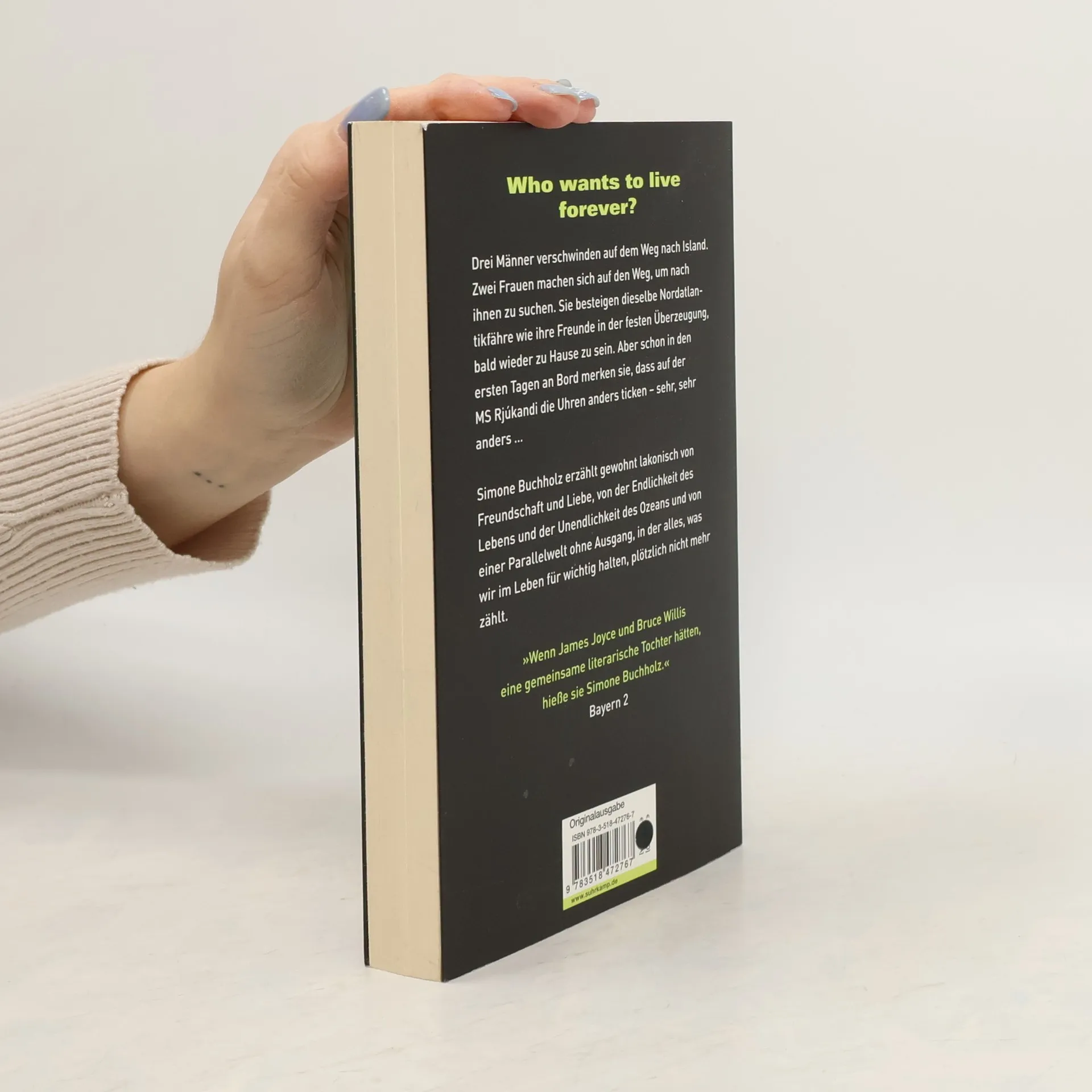 Drei Männer verschwinden spurlos auf der MS Rjúkandi, einer Nordatlantikfähre. Zwei Frauen machen sich auf den Weg, um nach ihren verschollenen Freunden zu suchen – und sie besteigen das Schiff nach Island in der festen Überzeugung, bald wieder zu Hause zu sein. Aber schon in den ersten Tagen an Bord fallen ihnen merkwürdige Dinge auf, und die seltsame Atmosphäre: Die Crew ist überirdisch gutaussehend, der Kapitän scheint bei aller Erhabenheit und Coolness stets einen Sack voll Schuld mit sich herumzuschleppen, und was zur Hölle ist eigentlich mit der Barfrau los? In unnachahmlicher Lakonie erzählt Simone Buchholz von Freundschaft und Liebe, von der Endlichkeit des Lebens und der Unendlichkeit des Ozeans, und von Iva und Malin, die sich plötzlich in einer Parallelwelt ohne Ausgang wiederfinden, in der alles, was sie im Leben für wichtig hielten, plötzlich nicht mehr zählt.