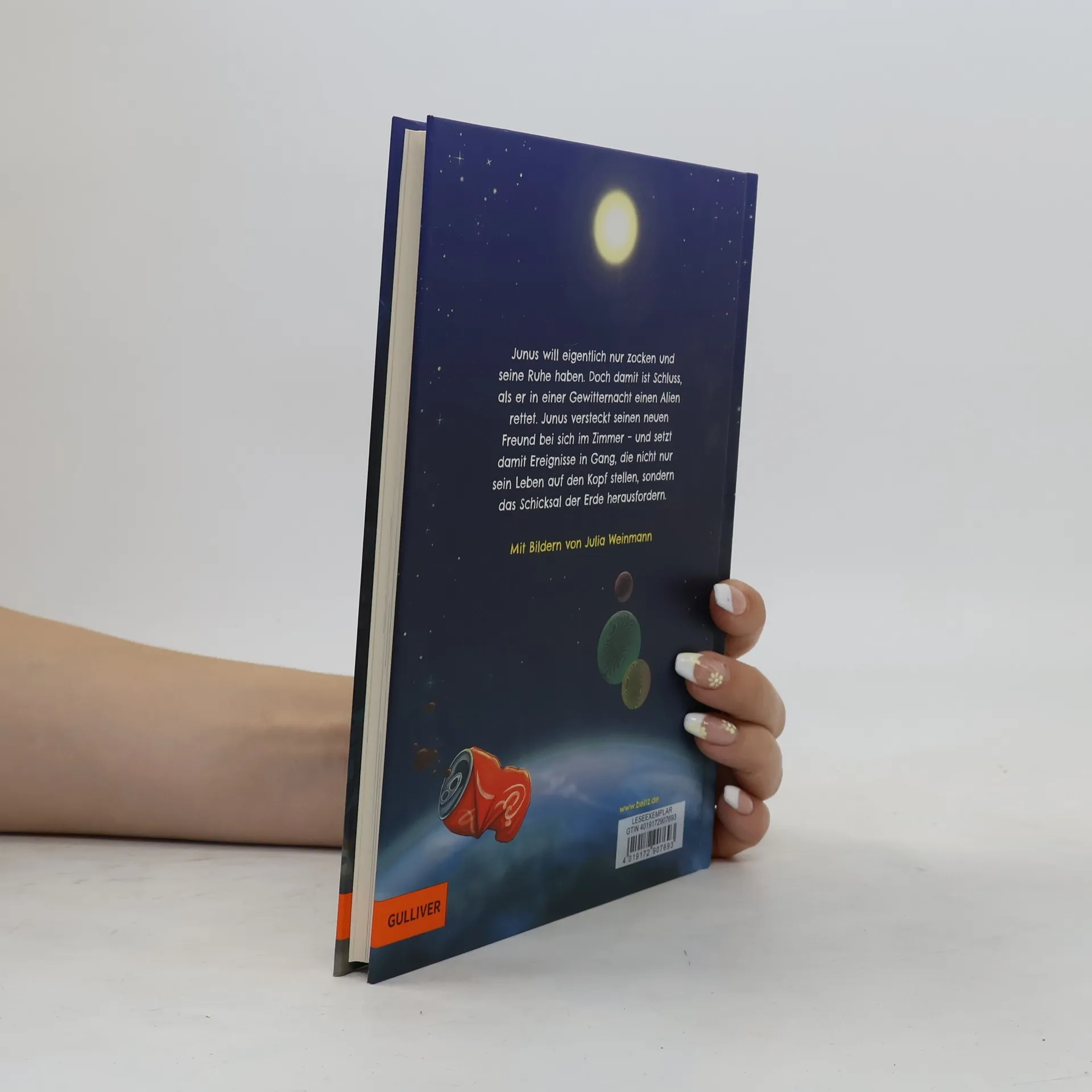 Junus Leben verändert sich völlig, als ein Alien abstürzt und er ihn verstecken muss. Der Alien Solo sieht nicht nur anders aus, er lebt auch völlig anders – trotzdem werden sie beste Freunde. Aber die Zeit läuft für Solo ab, er kann auf der Erde nicht überleben. Als Junus erfährt, dass die Aliens angreifen und den Planeten zerstören wollen, setzt er alles daran, um nicht nur Solo, sondern auch die Welt, zu retten. Eine Freundschaftsgeschichte mit einer Prise Science-Fiction – auch für Kinder, denen das Lesen noch nicht leichtfällt. Mit vielen Illustrationen von Julia Weinmann.