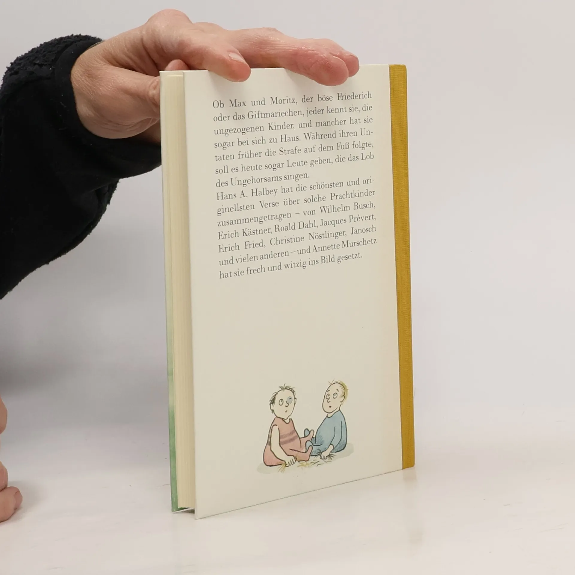 Gebet eines vernünftigen Jungen: "Laß unsern Nachbarn Warnekow / nicht mehr auf Amseln schießen. / Denn ihr'n Gesang, den lieb' ich so. / Ich würde es begrüßen, / wenn du etwas von seinem Blei / ließt um die Ecke fliegen / in seinen Arsch durch Zauberei. / Ach, mach mir das Vergnügen!„ Jeder kennt sie, die lieben Kleinen, die zu bösen Blagen werden können. Hans A. Halbey hat die schönsten und originellsten Verse über solche Prachtkinder zusammengetragen - von Wilhelm Busch, Erich Kästner, Roald Dahl, Christine Nöstlinger, Janosch und vielen anderen - und Annette Murschetz hat sie frech und witzig ins Bild gesetzt. “Es ist so recht ein Buch, das man jungen Eltern schenken sollte, damit sie sich von vornherein gar keine Illusionen machen." DIE WELT