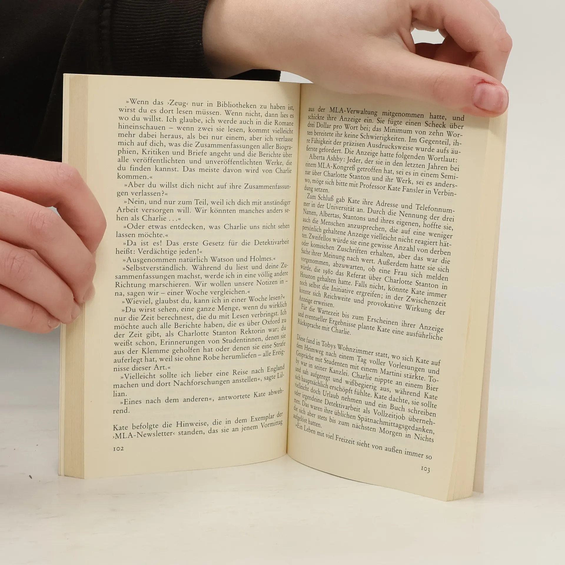 Kate Fansler, Literaturprofessorin und eine ausgesprochen unkonventionelle Person, hat wenig Lust, auf die langweilige Party ihres Bruders, eines gravitätischen Anwalts, zu gehen. Aber dann lässt sie sich doch überreden. Zum Glück - denn hier erfährt sie vom mysteriösen Verschwinden Alberta Ashbys, der Nichte und Erbin einer kürzlich verstorbenen englischen Schriftstellerin. Als Kate sich in Albertas Tagebuch vertieft, ist sie sofort fasziniert von dieser eigenwilligen und selbstbewussten Frau. Sie beginnt mit Nachforschungen, die sie in die seelischen Abgründe von Literaturspezialisten und anderen merkwürdigen Menschen und am Ende zu einer höchst überraschenden Lösung führen.