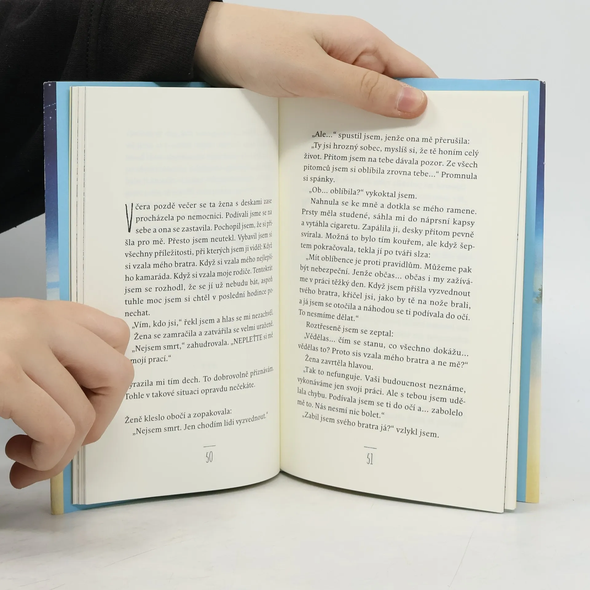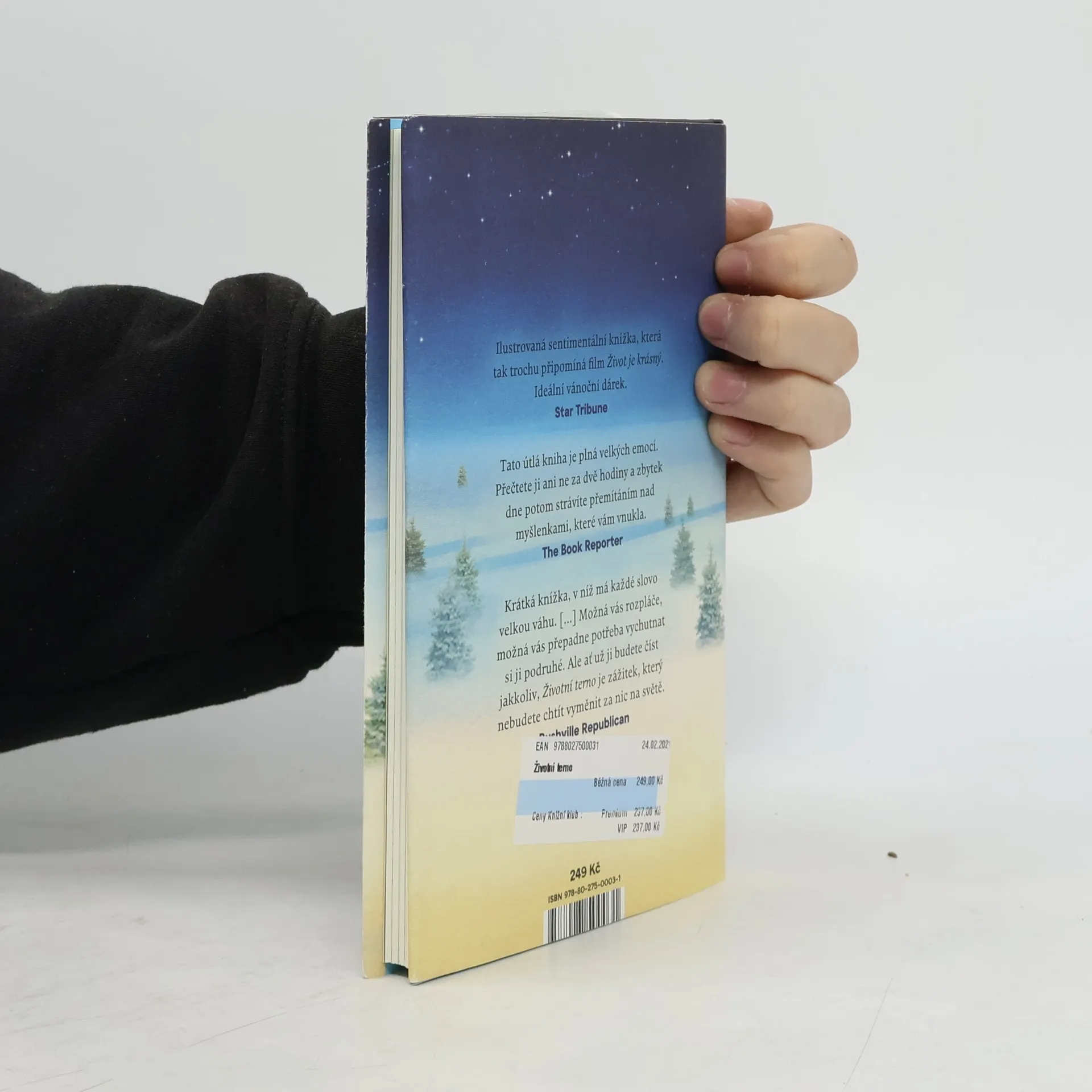 Je noc před Štědrým dnem a nemocniční chodbou kráčí žena v šedém, aby si odvedla jednoho z nás. Má s sebou desky se jmény nás všech: pětileté holčičky trpící rakovinou, která maluje svou oblíbenou židličku na červeno, dvacetiletého mladíka leštícího pivní sklenici v milované hospodě, pětačtyřicetiletého muže, který uhání tmou v drahém autě a hledá, do čeho by narazil. Někdo z nás dnes přijde o život, pokud se někdo jiný dobrovolně nevzdá toho svého. Ale nestačí pouze zemřít, protože život není jen to, co právě končí. Život je všechno to, co se stalo předtím. Fredrik Backman umí mistrně vylíčit lidské pochyby a vnitřní démony, aniž ztrácí smysl pro humor. Toto vyprávění je mnohem smutnější než třeba Dickensova Vánoční koleda, ale i zde najdeme naději a možnost všechno napravit — i když za velmi vysokou cenu.