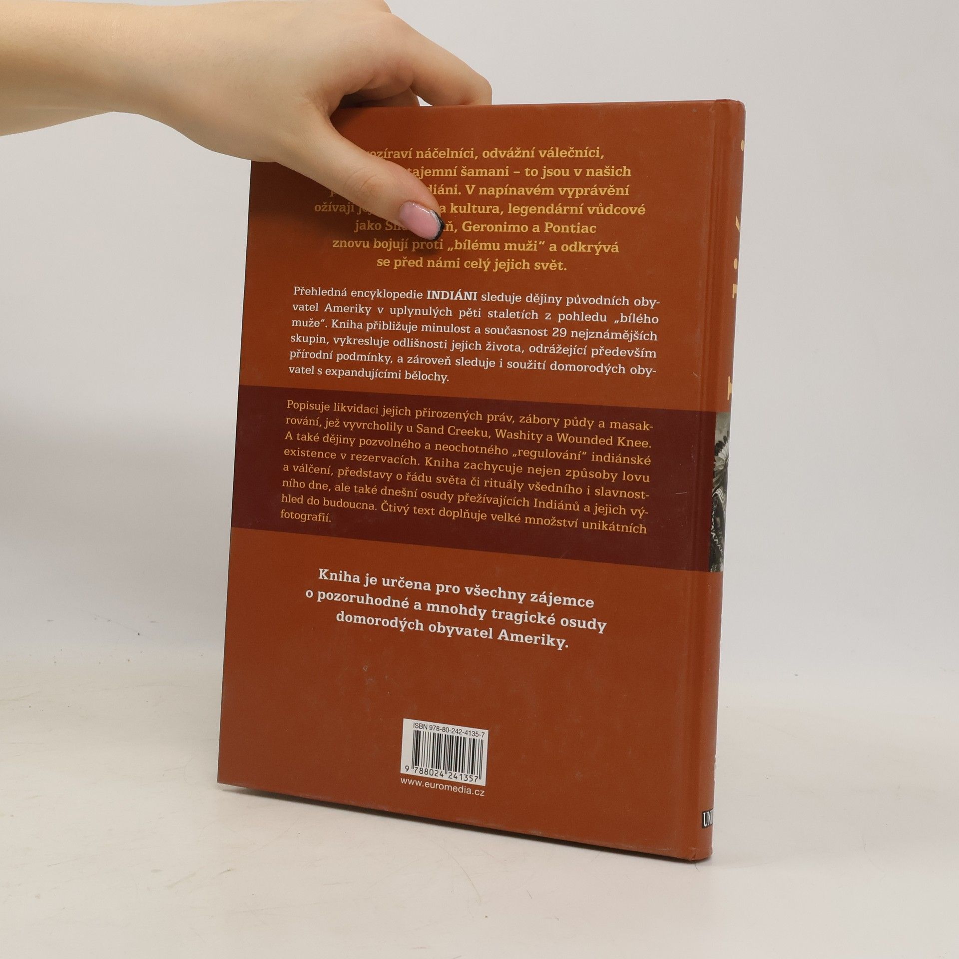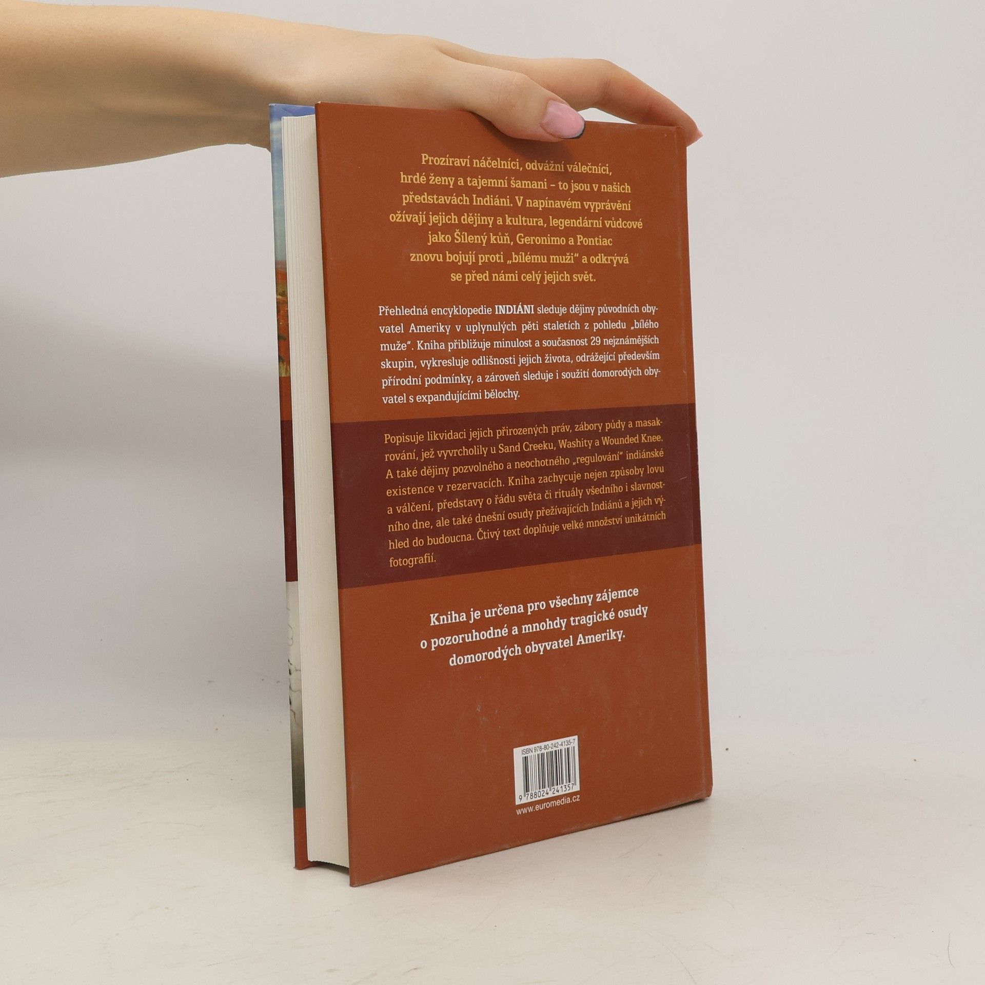 Přehledná encyklopedie INDIÁNI sleduje dějiny původních obyvatel Ameriky v uplynulých pěti staletích z pohledu „bílého muže“. Kniha přibližuje tradice a současnost 29 nejznámějších kmenů v 8 tematických oddílech. Autorovi se daří postihnout kmenové zvláštnosti, odrážející především přírodní podmínky jejich životního prostoru, a zároveň sleduje i soužití domorodých obyvatel s expandujícími bělochy. V jednotlivých kmenových portrétech přibližuje autor nejen indiánský lov a válčení, představu o řádu světa či rituály všedního i slavnostního dne kmenů, ale i jejich výhled do budoucna.