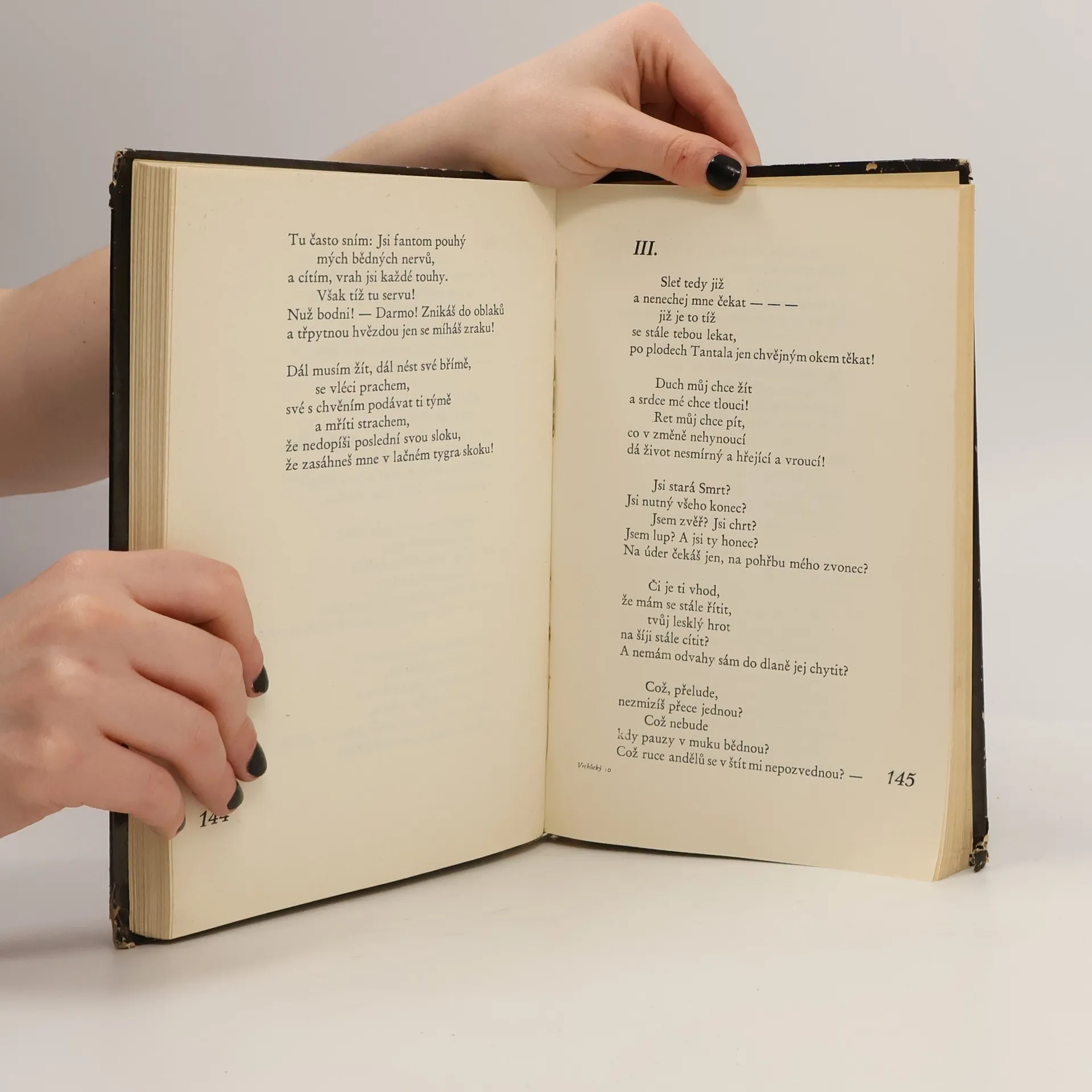 Básně z roku 1908, poslední Vrchlického kniha. Dává znovu propuknout novému černému dualismu člověka z vesmíru, myšlenky a hmoty, touhy a reality. V jiných básních této knihy však dospívá dlouhý vývoj jedné větve tvorby Vrchlického k ryzí, hluboké, čisté a niterné lyrice, intuitivněmelodické, nadosobního duchovního kouzla. Damoklův meč visí nad životem jako hrozba (jeho jméno – Ideál) a brání plnému užívání jeho radostí.