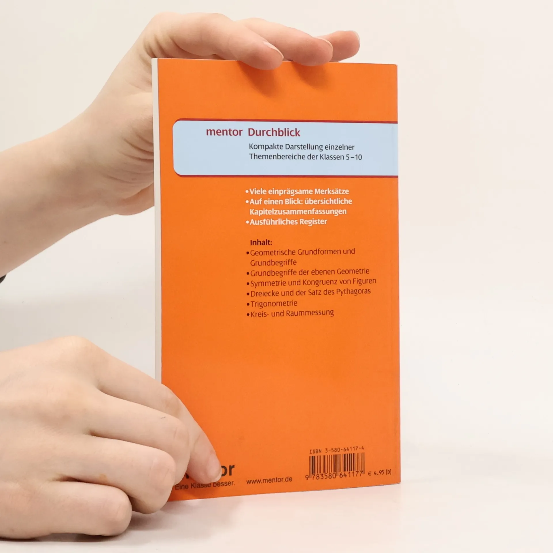 Geometrische Grundformen und -begriffe, Grundlagen der ebenen Geometrie, Symmetrie und Kongruenz von Figuren, Dreiecke und Satz des Pythagoras, Trigonometrie, Kreis-Raummessung.