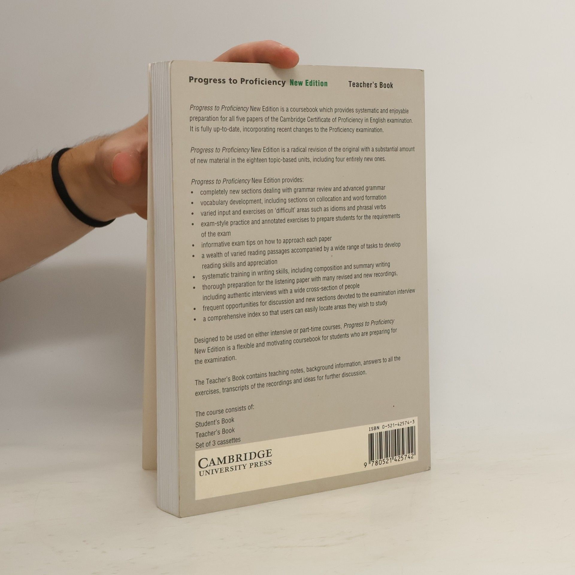 Progress to Proficiency is a new exam course which provides systematic, thorough and enjoyable preparation for the Cambridge Proficiency examination. Each of the eighteen units is based on a different topic and contains a variety of exercises and activities to develop the language skills required in the exam: vocabulary, reading, use of English, listening comprehension, oral communication and composition. The accompanying cassettes contain listening comprehension exercises, and the Teacher's Book gives teaching notes, answer keys, transcripts of recordings, and lots of ideas for discussion.