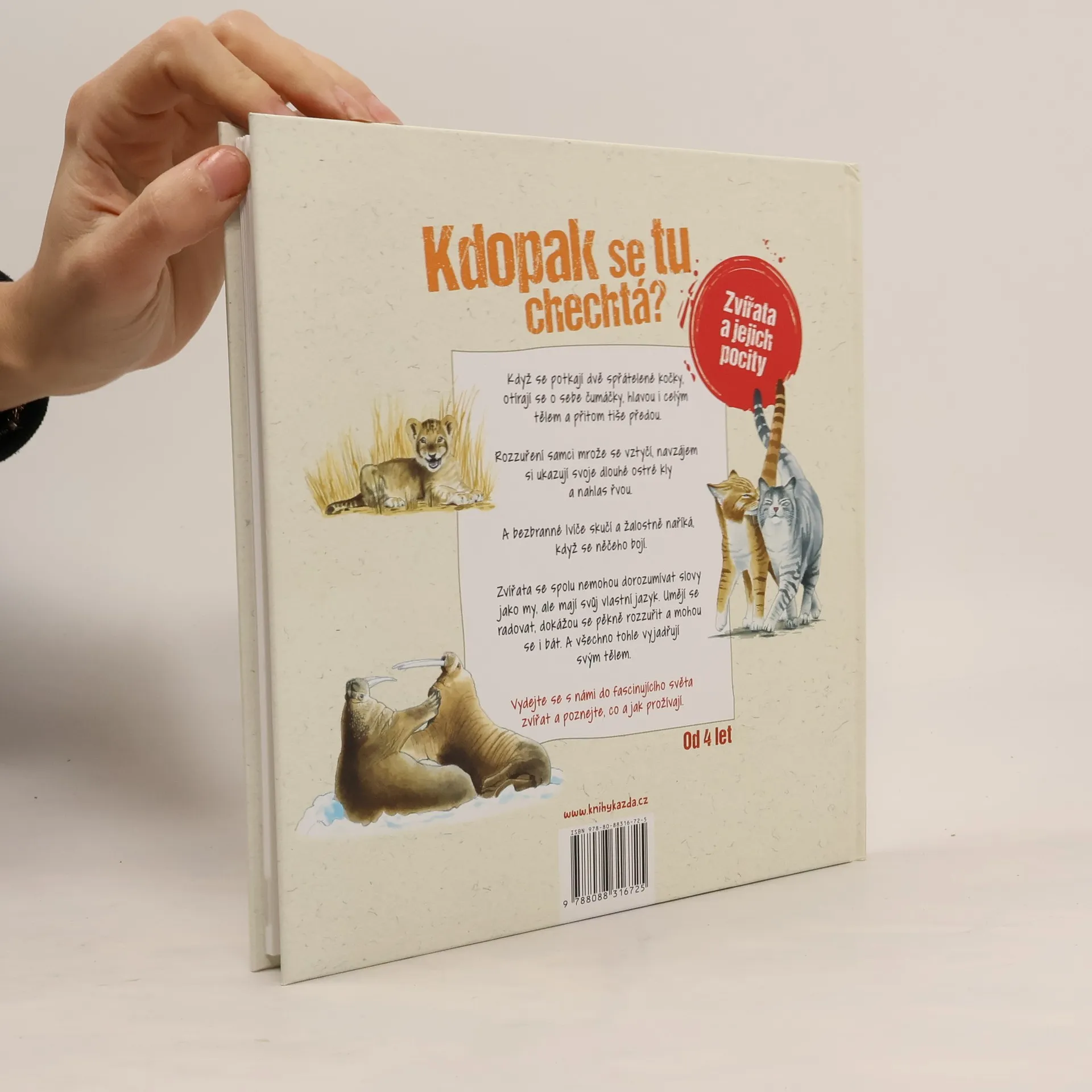 Když se potkají dvě spřátelené kočky, otírají se o sebe čumáčky, hlavou i celým tělem a přitom tiše předou. Rozzuření samci mrože se vztyčí, navzájem si ukazují svoje dlouhé ostré kly a nahlas řvou. A bezbranné lvíče skučí a žalostně naříká, když se něčeho bojí. Zvířata se spolu nemohou dorozumívat slovy jako my lidé, ale mají svůj vlastní jazyk. Umějí se radovat, dokážou se pěkně rozzuřit a mohou se i bát. A všechno tohle vyjadřují svým tělem.