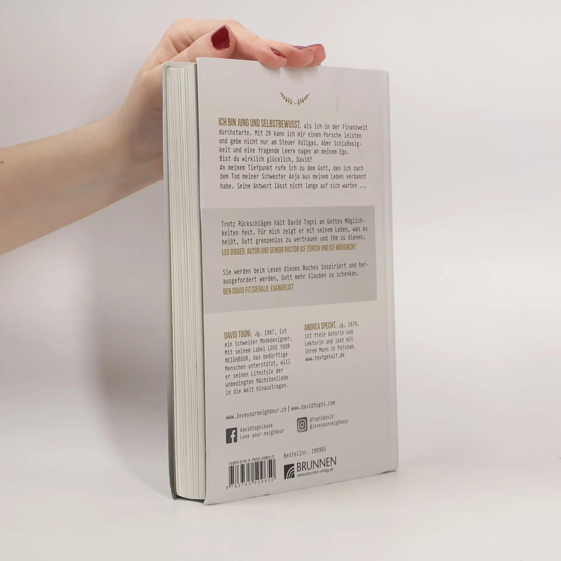 Ich bin jung und selbstbewusst, als ich in der Finanzwelt durchstarte. Mit 20 kann ich mir einen Porsche leisten und gebe nicht nur am Steuer Vollgas. Aber Schlaflosigkeit und eine fragende Leere nagen an meinem Ego. Bist du wirklich glücklich, David? An meinem Tiefpunkt rufe ich zu dem Gott, den ich nach dem Tod meiner Schwester Anja aus meinem Leben verbannt habe. Seine Antwort lässt nicht lange auf sich warten ... LOVE YOUR NEIGHBOUR: Das Buch über den Initiator einer Bewegung, die zum Lifestyle wird - mitreißend, ansteckend, inspirierend: www.loveyourneighbour.ch Stimmen zum Buch: Trotz Rückschlägen hält David Togni an Gottes Möglichkeiten fest. Für mich zeigt er mit seinem Leben, was es heißt, Gott grenzenlos zu vertrauen und ihm zu dienen.