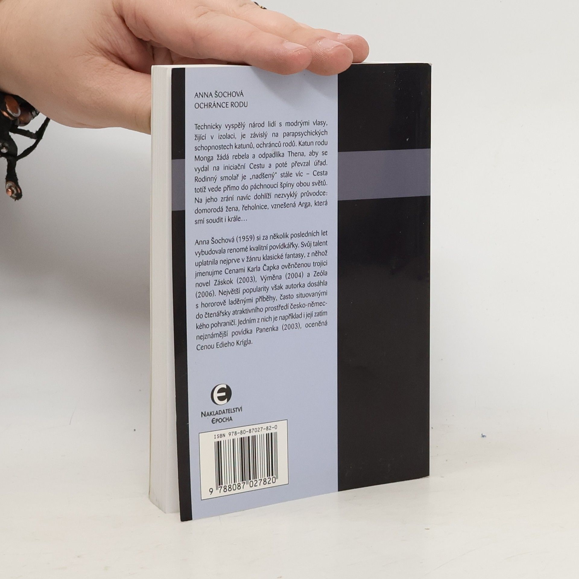 Technicky vyspělý národ lidí s modrými vlasy, žijící v izolaci, je závislý na parapsychických schopnostech katunů, ochránců rodů. Katun rodu Monga žádá rebela a odpadlíka Thena, aby se vydal na iniciační Cestu a poté převzal úřad. Rodinný smolař je „nadšený“ stále víc – Cesta totiž vede přímo do páchnoucí špíny obou světů. Na jeho zrání navíc dohlíží nezvyklý průvodce: Domorodá žena, řeholnice, vznešená Arga, která smí soudit i krále… Anna Šochová (1959) si za několik posledních let vybudovala renomé kvalitní povídkářky. Svůj talent uplatnila nejprve v žánru klasické fantasy, z něhož jmenujme Cenami Karla Čapka ověnčenou trojici novel Záskok (2003), Výměna (2004) a Zeóla (2006). Největší popularity však autorka dosáhla s hororově laděnými příběhy, často situovanými do čtenářsky atraktivního prostředí česko-německého pohraničí. Jedním z nich je například i její zatím nejznámější povídka Panenka (2003), oceněná Cenou Edieho Krígla