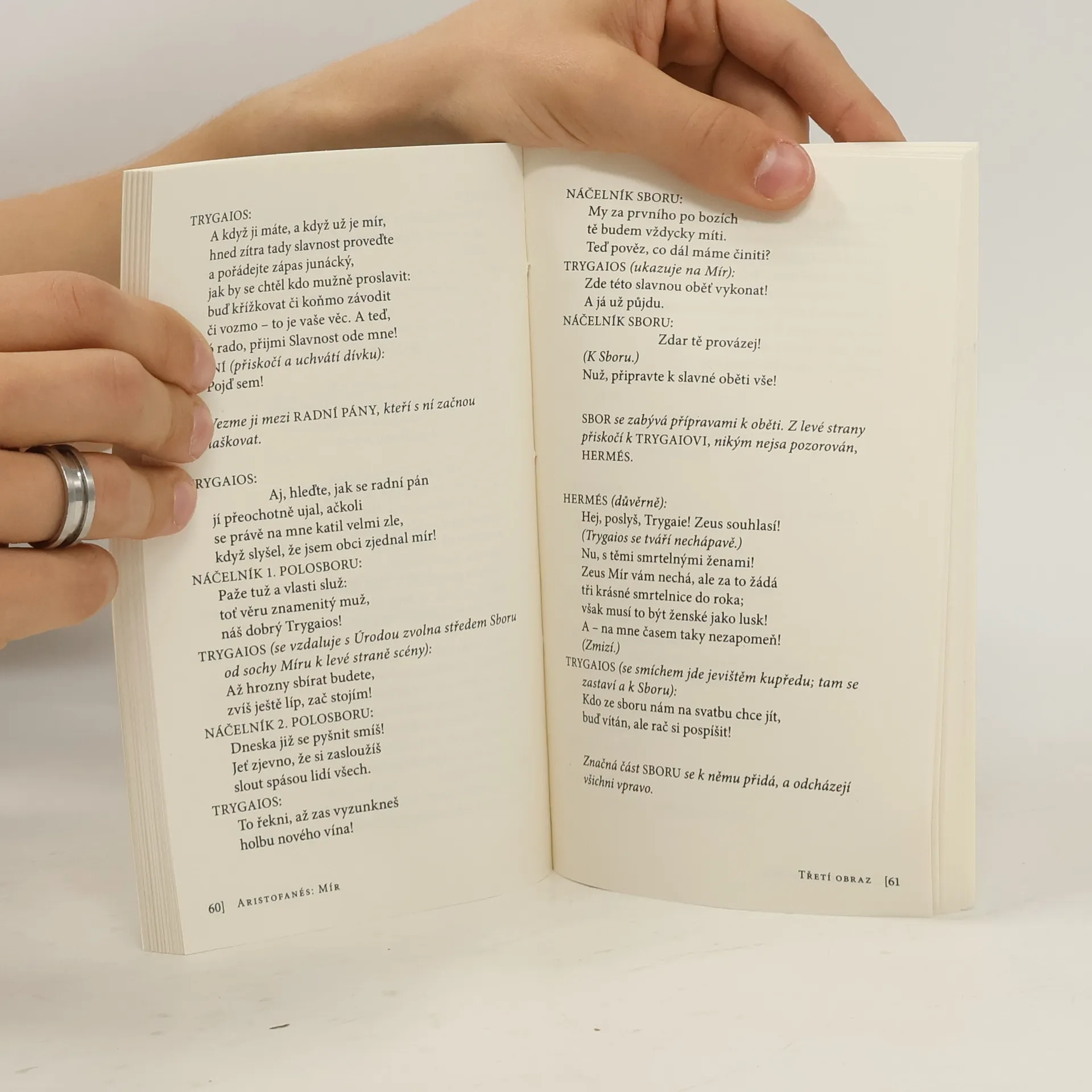 Komedie slavného starořeckého dramatika. Hrdinou hry je athénský vinař Trygaios, který se nikoli na Pegasu, jak by se slušelo, ale na hřbetě smrdutého obřího chrobáka vydá na Olymp, aby u Dia orodoval za ukončení války. Jeho satirický pohled míří na vojevůdce i politiky obou znesvářených zemí, nešetří ani bohy, kteří podlehnou "korupci". Nakladatelská anotace. Kráceno.