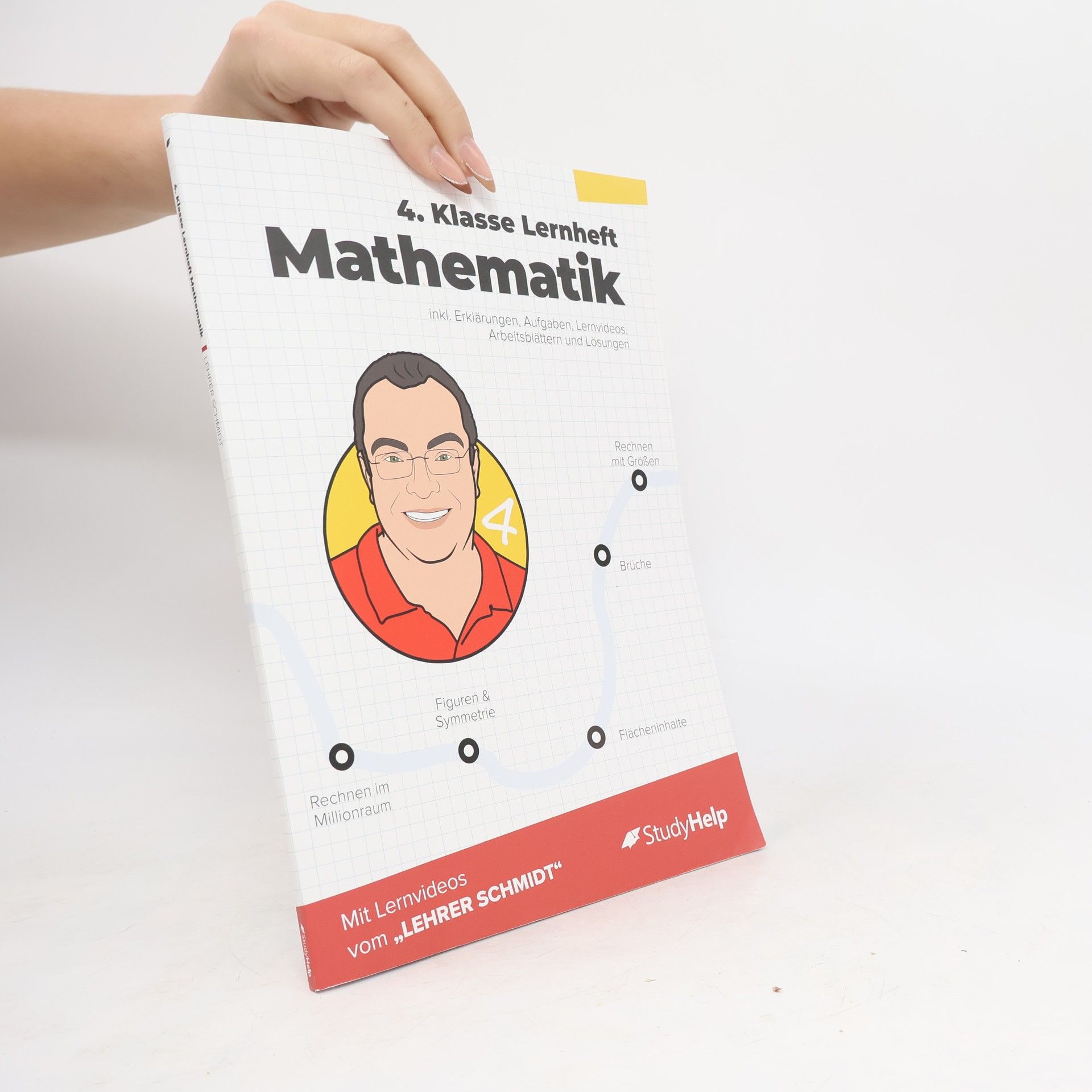 Unser Lernheft ist die ideale Ergänzung zu deinem Schulbuch und hilft dir mit Lernvideos von „Lehrer Schmidt“, nicht den Überblick zu verlieren! 100 Seiten starkes Lernheft Mathe für die 4. Klasse (Grundschule) anschauliche Erklärungen 49 Lernvideos von „Lehrer Schmidt“ (ohne Werbung) über 30 Arbeitsblätter zum Download + 6 interaktive Übungsaufgaben 58 Aufgaben inkl. Lösungen Hier findest du Erklärungen und Beispielaufgaben zu allen relevanten Themen der 4. Klasse für Grundschulen. Ganz egal, ob du einfach nur den aktuellen Stoff vertiefen oder bereits in der Schule gelerntes wiederholen willst, hier wirst du fündig. Vermeintlich komplizierte Zusammenhänge sind in einer für dich vollkommen verständlichen Sprache dargestellt. Außerdem findest du zu den Themen alle Merksätze, Skizzen und was sonst noch notwendig ist, um den Sachverhalt zu verstehen. Dazu helfen dir nicht nur die Lernvideos, sondern auch die zusätzlichen Arbeitsblätter, die allesamt höchst didaktisch für dich aufbereitet sind. Alle Themen sind in übersichtliche Kapitel unterteilt, die dich sinnvoll durch die 4. Klasse leiten werden. Informationen für Eltern: Im 4. Schuljahr wird im Millionraum gerechnet. Dieser Zahlenraum ist schwer zu überblicken, die Menge 1 000 000 schwer vorstellbar. Mit dem Millionbuch (und auch mit dem Millionfeld) gibt es eine gute Möglichkeit, in den großen Zahlenraum Stuktur und Übersichtlichkeit hineinzubringen. Mit der Stellentafel wird ein weiterer Zugang zum neuen Zahlenraum geschaffen. Die Schriftliche Multiplikation und die Schriftliche Division werden im 2. Halbjahr eingeführt. Das Rechnen mit Größen in Sachzusammenhängen gewinnt im 4. Schuljahr weiter an Bedeutung. Geometrische Körper werden analysiert und der Umgang mit Zirkel und Geodreieck wird trainiert. Themen im Überblick: Festigen des Rechnens im Tausenderraum Orientierung im Millionraum Rechnen im Millionraum Zeichnen geometrischer Formen und Figuren Symmetrie Brüche kennen lernen Flächeninhalte Rechnen mit Größen Daten, Häufigkeiten und Wahrscheinlichkeiten Lösungen Nutze die „Blick ins Buch“ Funktion für einen tieferen Einblick in dieses Lernheft!