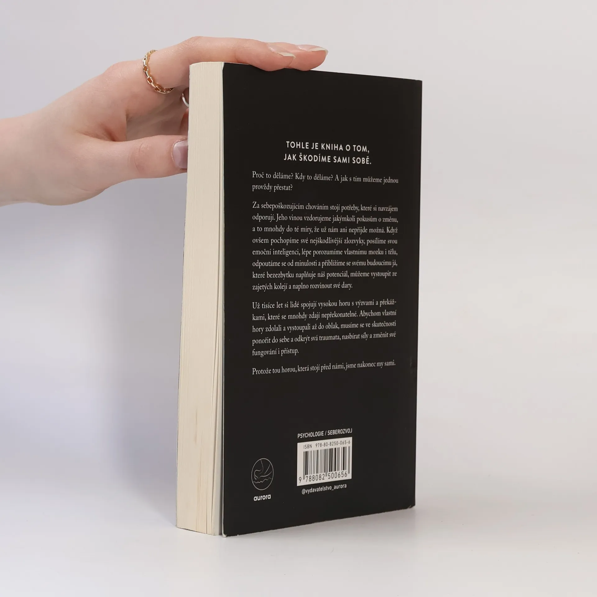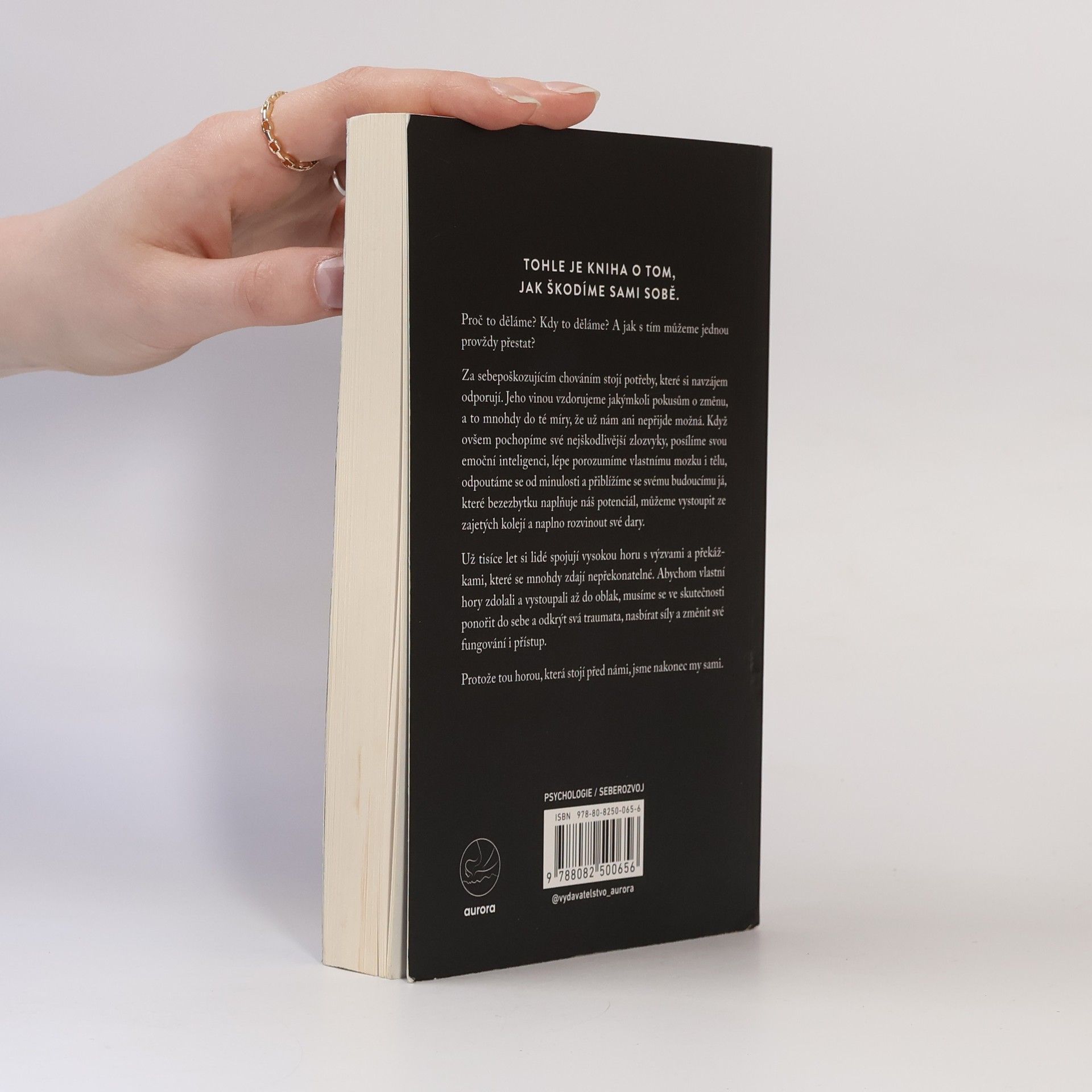 Tato kniha se zaměřuje na to, jak si nevědomky škodíme a proč k tomu dochází. Kdy se sebepoškozující chování objevuje a jak ho můžeme nadobro překonat? Jeho příčinou jsou protichůdné potřeby, které nás často brzdí ve snaze změnit svůj život, až si začneme myslet, že změna není možná. Pokud se však dokážeme podívat na své škodlivé zvyky zblízka, zvýšit svou emoční inteligenci, lépe pochopit fungování vlastního těla a mysli, odpoutat se od minulosti a přiblížit se své budoucí verzi, která plně využívá svůj potenciál, můžeme se osvobodit z těchto vzorců chování a rozvinout své schopnosti naplno. Lidé si již tisíce let spojují vysoké hory s překážkami, které se zdají nepřekonatelné. Abyste však zdolali svou vlastní horu a dosáhli vrcholu, musíte nejprve zaměřit pohled do nitra, odhalit svá traumata, nabrat sílu a změnit svůj přístup. Protože tou největší horou, kterou musíte překonat, jste ve skutečnosti vy sami.