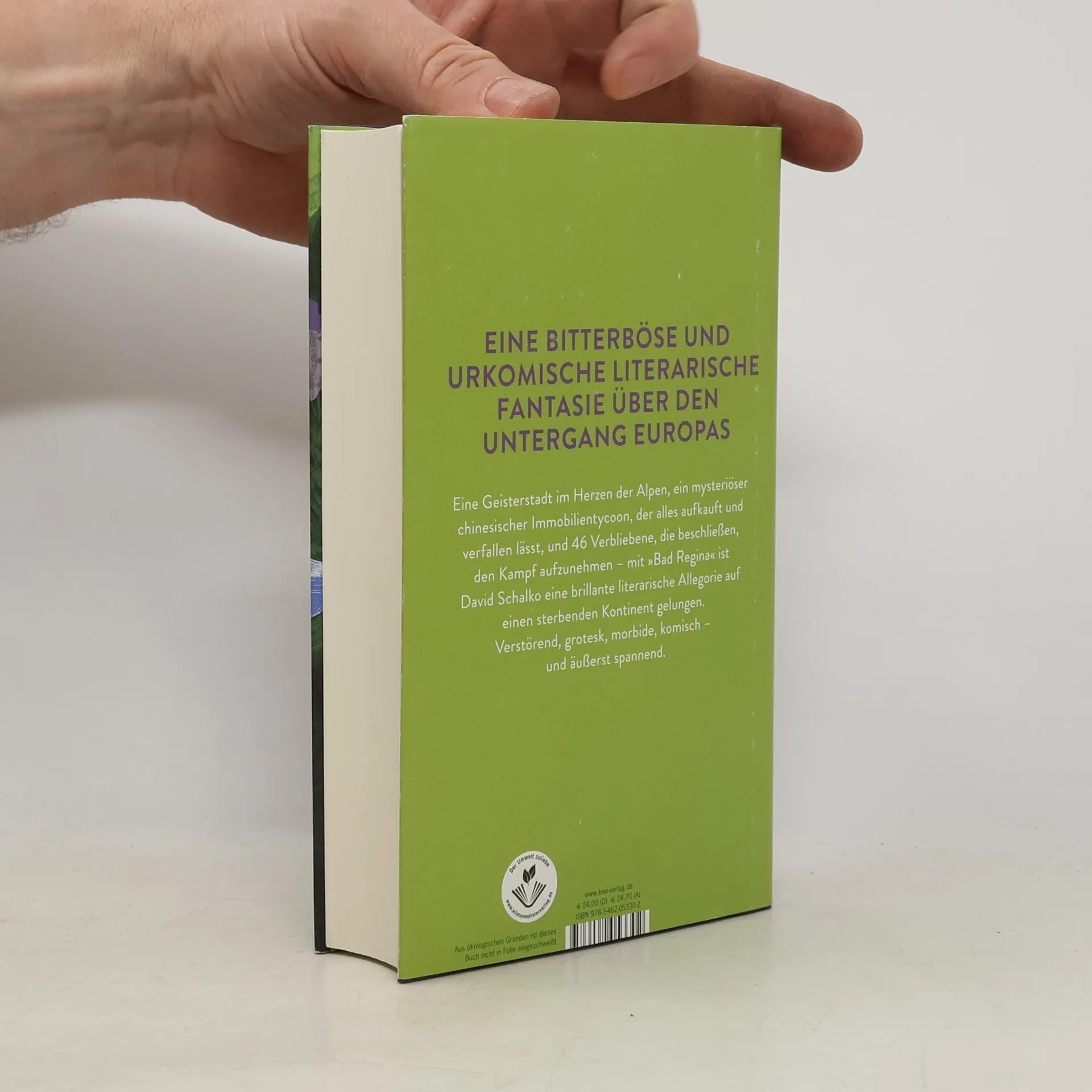 Eine bitterböse und urkomische literarische Fantasie über den Untergang Europas. In einer Geisterstadt im Herzen der Alpen leben nur noch wenige Menschen, die auf die Ruinen ihres einst glamourösen Touristenorts starren und tatenlos beim Verschwinden zusehen. Ein mysteriöser chinesischer Immobilienmagnat namens Chen kauft seit Jahren ihre Häuser für horrende Summen, nur um sie verfallen zu lassen. Als er auch das Schloss des alten Adels erwerben will, beschließt Othmar, der von Gicht geplagte Betreiber des berühmtesten Partyklubs der Alpen, herauszufinden, was Chen mit Bad Regina vorhat. Dabei erleben Othmar und die verbliebenen Einwohner eine böse Überraschung. David Schalko entwirft eine faszinierende Geisterwelt, in der die verbliebenen Bewohner und Bauwerke wankende Ruinen der Vergangenheit sind. Der Roman ist verstörend, grotesk und komisch zugleich und bietet eine spannende Allegorie auf einen sterbenden Kontinent. Es wird ein Europa thematisiert, das immer wieder moralisch versagt, während andere über seine Zukunft entscheiden.