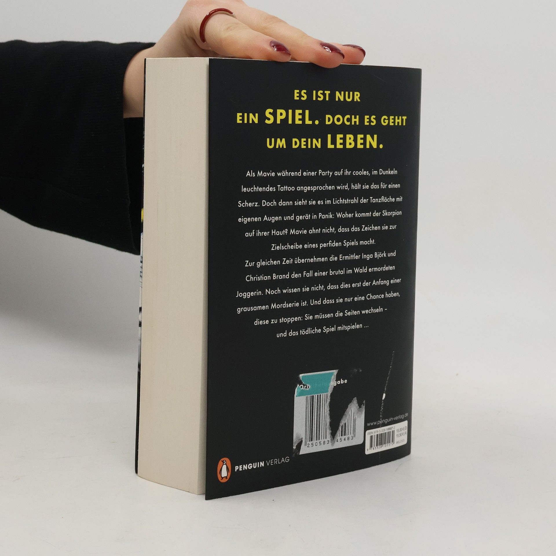 Sie jagen dich. Sie töten dich. Als Mavie während einer Party auf ihr cooles, im Dunkeln leuchtendes Tattoo angesprochen wird, hält sie das für einen Scherz. Doch dann sieht sie es im Lichtstrahl der Tanzfläche mit eigenen Augen und gerät in Panik: Woher kommt der Skorpion auf ihrer Haut? Mavie ahnt nicht, dass das Zeichen sie zur Zielscheibe eines perfiden Spiels macht. Zur gleichen Zeit übernehmen die Ermittler Inga Björk und Christian Brand den Fall einer brutal im Wald ermordeten Joggerin. Noch wissen sie nicht, dass dies erst der Anfang einer grausamen Mordserie ist. Und dass sie nur eine Chance haben, diese zu stoppen: Sie müssen die Seiten wechseln – und das tödliche Spiel mitspielen …