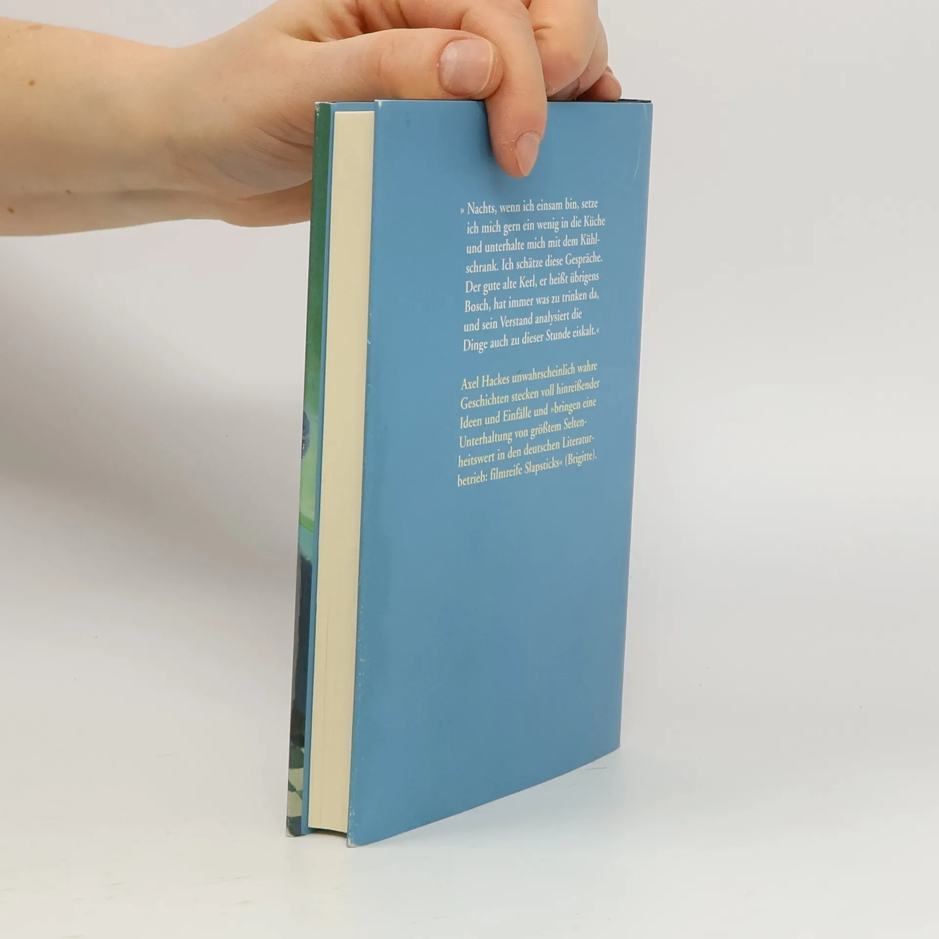 »Eines Tages, als ich allein in der Kneipe stand, zupfte mich ein riesiges graugrünes Monster am Ärmel und sagte: Hey, willste nich mal ein Buch schreiben? Ich hab nix mehr zu lesen!« Zum Glück hat Axel Hacke auf das Monster gehört. Und deshalb wissen wir jetzt, wie man sich den Abend vertreiben kann: »Nachts, wenn ich einsam bin, setze ich mich gern ein wenig in die Küche und unterhalte mich mit dem Kühlschrank. Ich schätze diese Gespräche. Der gute alte Kerl, er heißt übrigens Bosch, hat immer was zu trinken da, und sein Verstand analysiert die Dinge auch zu dieser Stunde eiskalt.« Aber man erfährt auch die wahre Geschichte über das traurige Leben des Schriftstellers Gehret und seine fantastische Sprachbesessenheit. Das Wahre ist, bei Tageslicht betrachtet, genauso unwahrscheinlich wie das Unwahrscheinliche wahr. Ob erlebt oder erfunden, wer möchte das bei diesen liebevoll-ironischen, dabei sehr genauen Beobachtungen eines skurrilen Alltags noch entscheiden. »Hinreißende Ideen und Einfälle bringen eine Unterhaltung von größtem Seltenheitswert in den deutschen Literaturbetrieb: filmreife Slapsticks.« Brigitte.