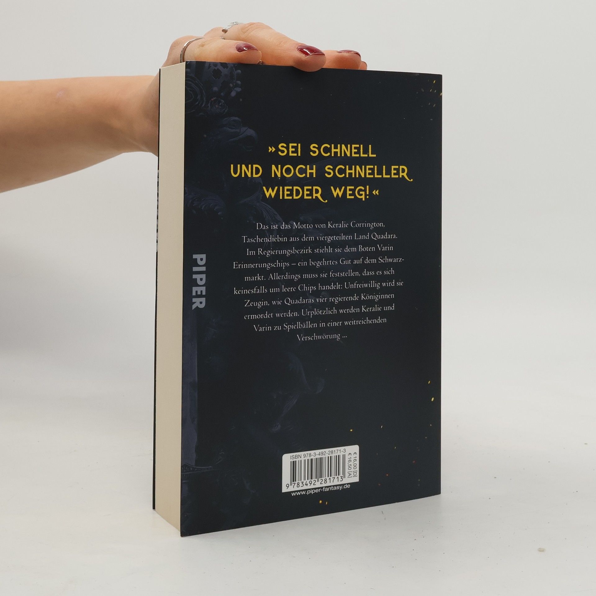 »Sei schnell und noch schneller wieder weg«, das ist das Motto von Keralie Corrington, Taschendiebin aus Quadara. Im Regierungsbezirk von Quadara stiehlt sie dem Boten Varin Erinnerungschips – ein begehrtes Gut auf dem Schwarzmarkt. Allerdings muss sie feststellen, dass es sich keinesfalls um leere Chips handelt: Unfreiwillig wird sie Zeugin, wie Quadaras vier regierende Königinnen ermordet werden. Keralie und Varin werden unfreiwillig zu Spielbällen einer weitreichenden Verschwörung. Zusammen versuchen sie, den Strippenziehern zu entkommen und deren Pläne zu vereiteln.