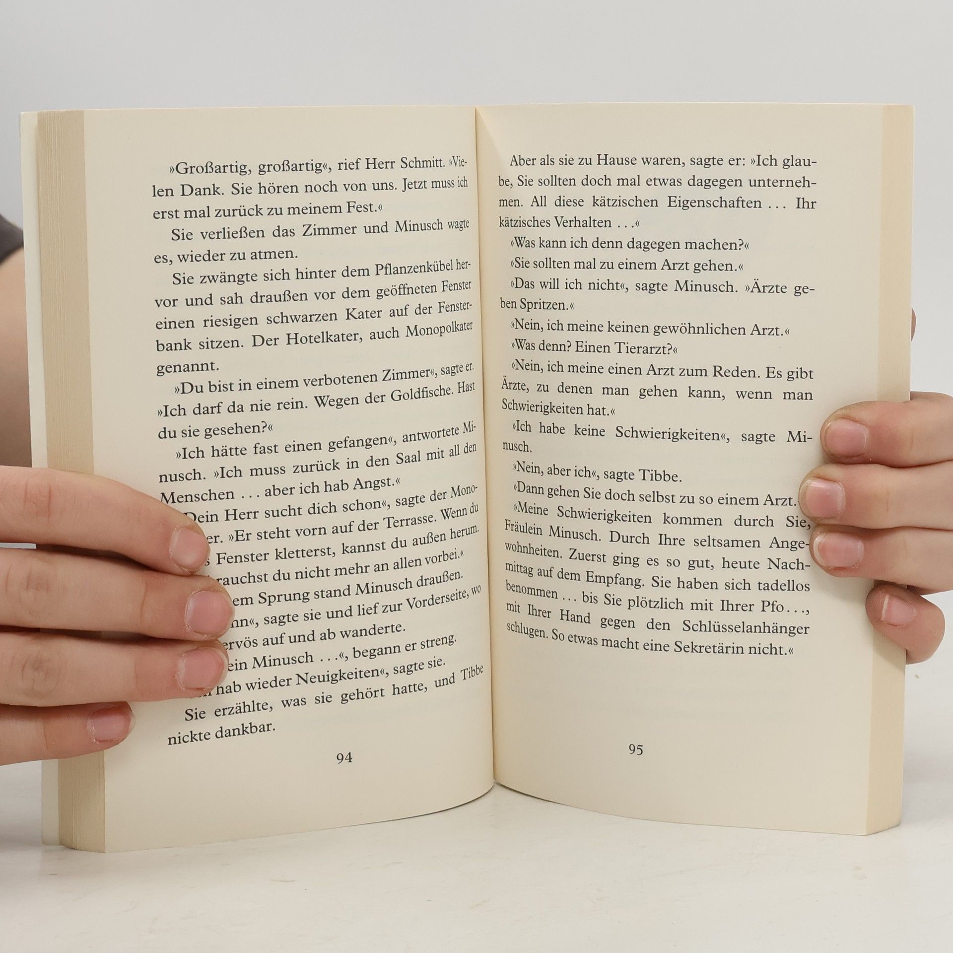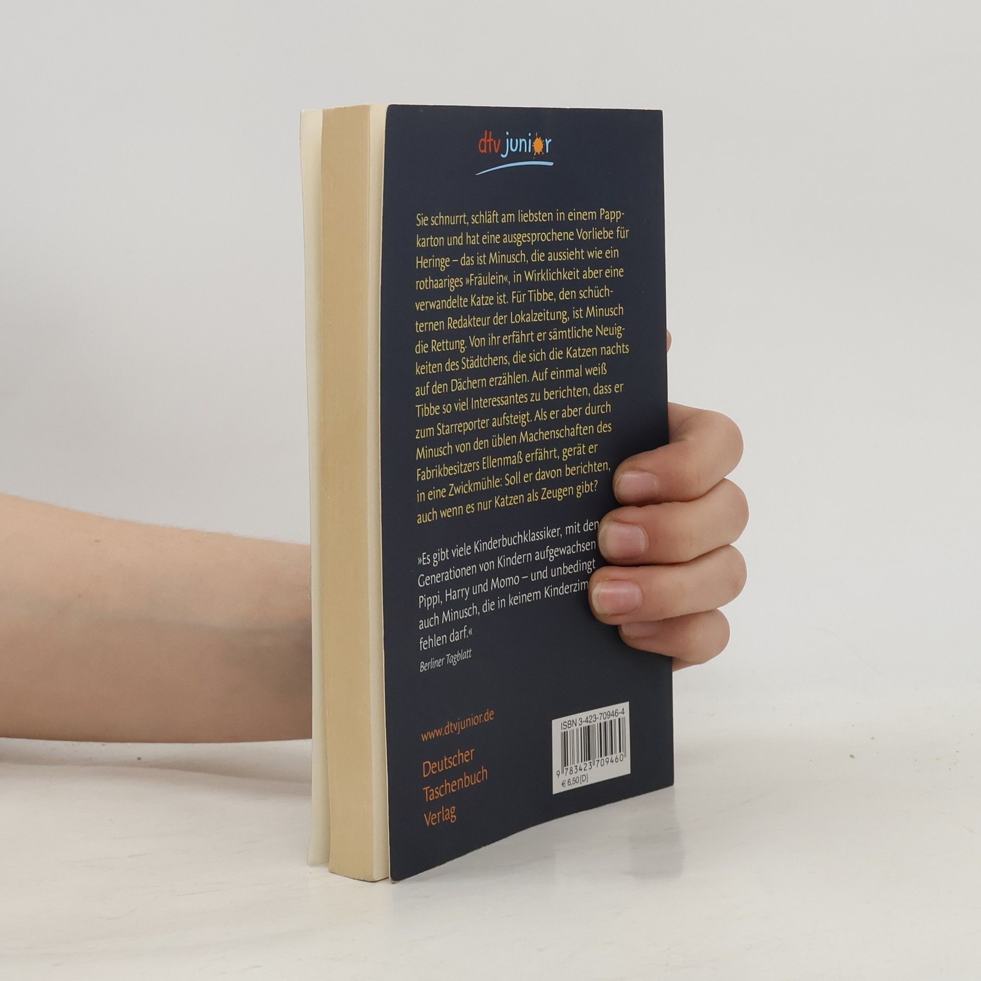 Sie schnurrt, schläft am liebsten in einem Pappkarton und hat eine ausgesprochene Vorliebe für Heringe – das ist Minusch, die aussieht wie ein rothaariges »Fräulein«, in Wirklichkeit aber eine verwandelte Katze ist. Für Tibbe, den schüchternen Redakteur der Lokalzeitung, ist Minusch die Rettung. Von ihr erfährt er sämtliche Neuigkeiten des Städtchens, die sich die Katzen nachts auf den Dächern erzählen. Auf einmal weiß Tibbe so viel Interessantes zu berichten, dass er zum Starreporter aufsteigt. Als er aber durch Minusch von den üblen Machenschaften des Fabrikbesitzers Ellenmaß erfährt, gerät er in eine Zwickmühle: Soll er davon berichten, auch wenn es nur Katzen als Zeugen gibt?