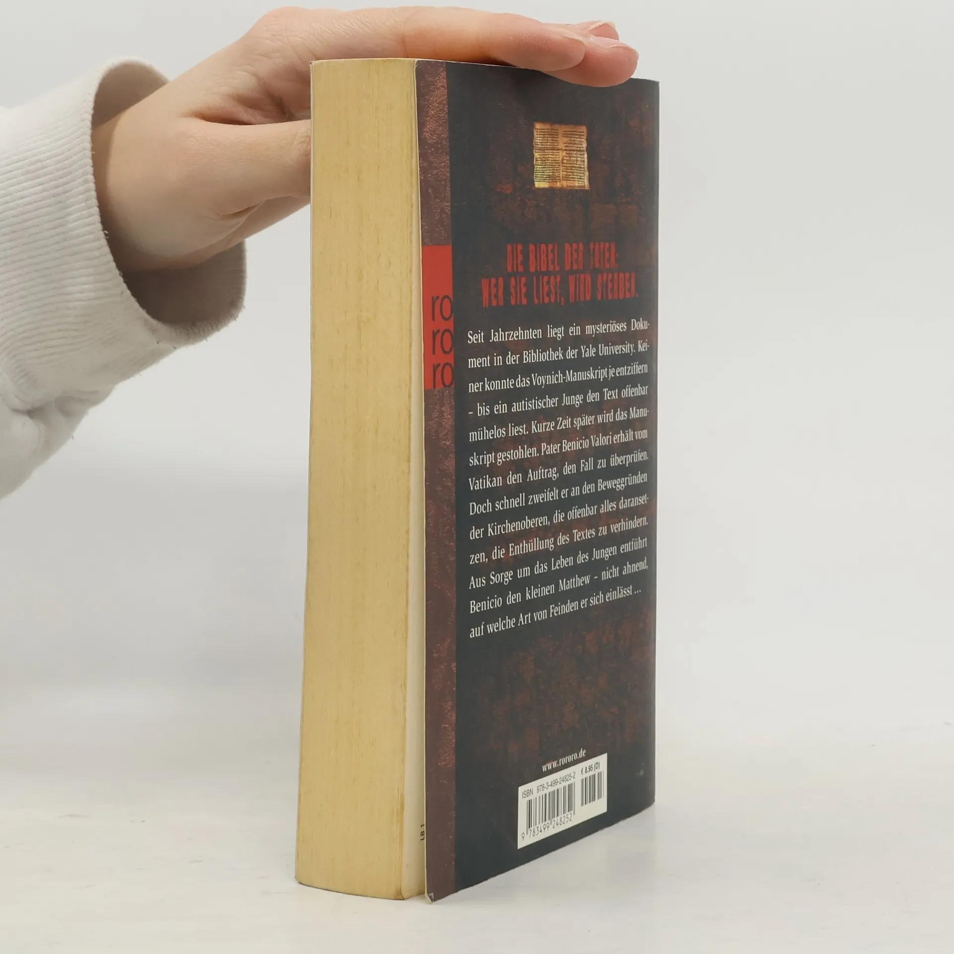 DIE BIBEL DER TOTEN: WER SIE LIEST, WIRD STERBEN.Seit Jahrzehnten liegt ein mysteriöses Dokument in der Bibliothek der Yale University. Keiner konnte das Voynich-Manuskript je entziffern – bis ein autistischer Junge den Text offenbar mühelos liest. Kurze Zeit später wird das Manuskript gestohlen. Pater Benicio Valori erhält vom Vatikan den Auftrag, den Fall zu überprüfen. Doch schnell zweifelt er an den Beweggründen der Kirchenoberen, die offenbar alles daransetzen, die Enthüllung des Textes zu verhindern. Aus Sorge um das Leben des Jungen entführt Benicio den kleinen Matthew - nicht ahnend, auf welche Art von Feinden er sich-einlässt ...