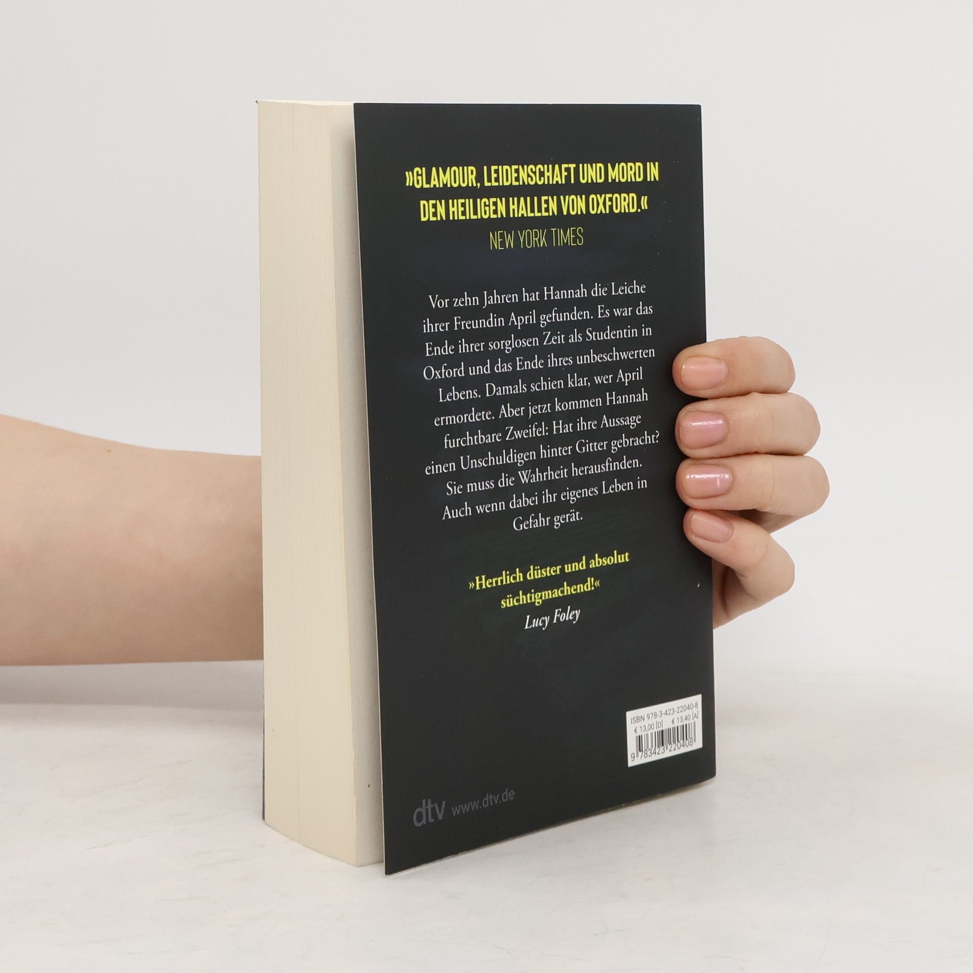 Du kennst den Mörder. Aber es ist nicht, wer du denkst. Der raffinierte Thriller in atmosphärischem Oxford-Setting von Spiegel-Bestseller-Autorin Ruth Ware jetzt als Taschenbuch! Eine verschworene Clique in Oxford. Ein abscheuliches Verbrechen. Ein unschuldig Verurteilter? Vor zehn Jahren hat Hannah die Leiche ihrer Freundin April gefunden. Es war das Ende ihrer sorglosen Zeit als Studentin in Oxford und das Ende ihres unbeschwerten Lebens. Damals schien klar, wer April ermordete. Aber jetzt kommen Hannah furchtbare Zweifel: Hat ihre Aussage einen Unschuldigen hinter Gitter gebracht? Sie muss die Wahrheit herausfinden. Auch wenn dabei ihr eigenes Leben in Gefahr gerät. »Unglaublich fesselnder Schreibstil, düster spannend mit erstaunlichen Wendungen. Top!« Mainhatten Kurier Von Ruth Ware sind bei dtv außerdem folgende spannende Thriller erschienen:  Woman in Cabin 10 Hinter diesen Türen Wie tief ist deine Schuld Im dunklen, dunklen Wald Der Tod der Mrs Westaway Das Chalet Das College Zero Days